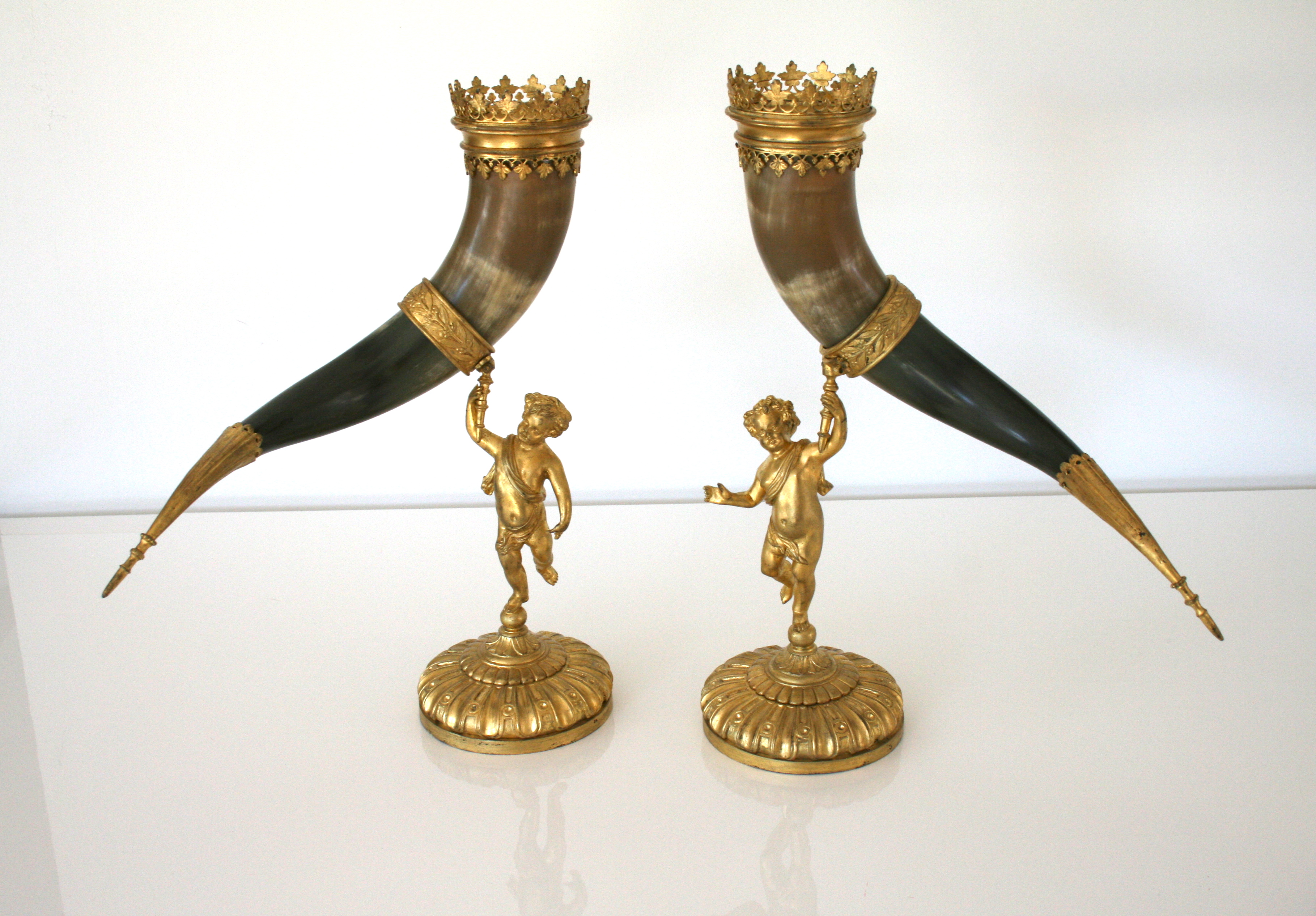 Rare pair of mounted objects, forming « Cornucopia » natural horn. Beautiful gilt bronze mounts supported by putti, based on round bases gadrooned gilded bronze.