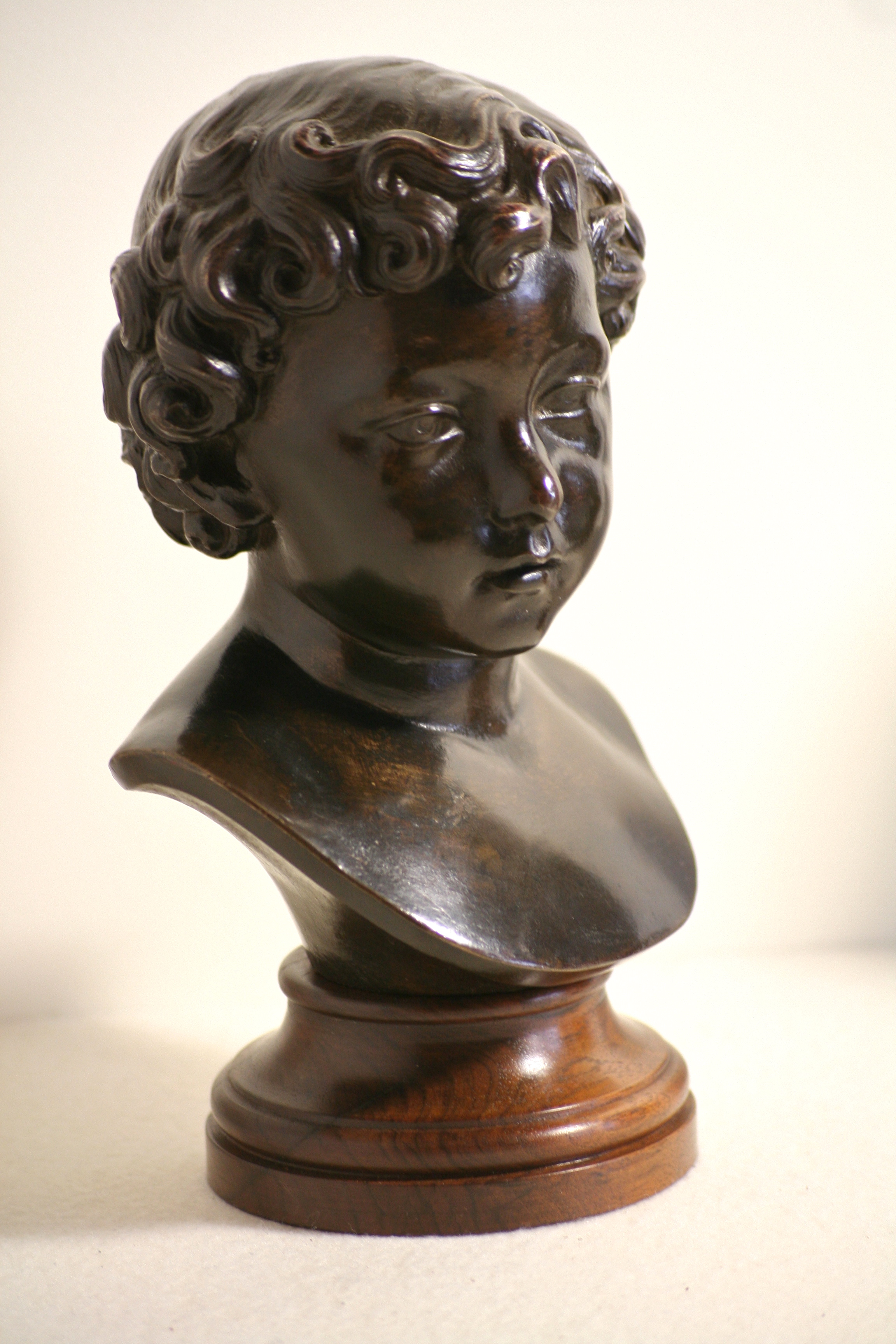 Pair of bronze busts in a brown patina, representing young children, a boy and a girl, probably brother and sister on a wooden foot shower base. Beautiful ancient bronze cast.