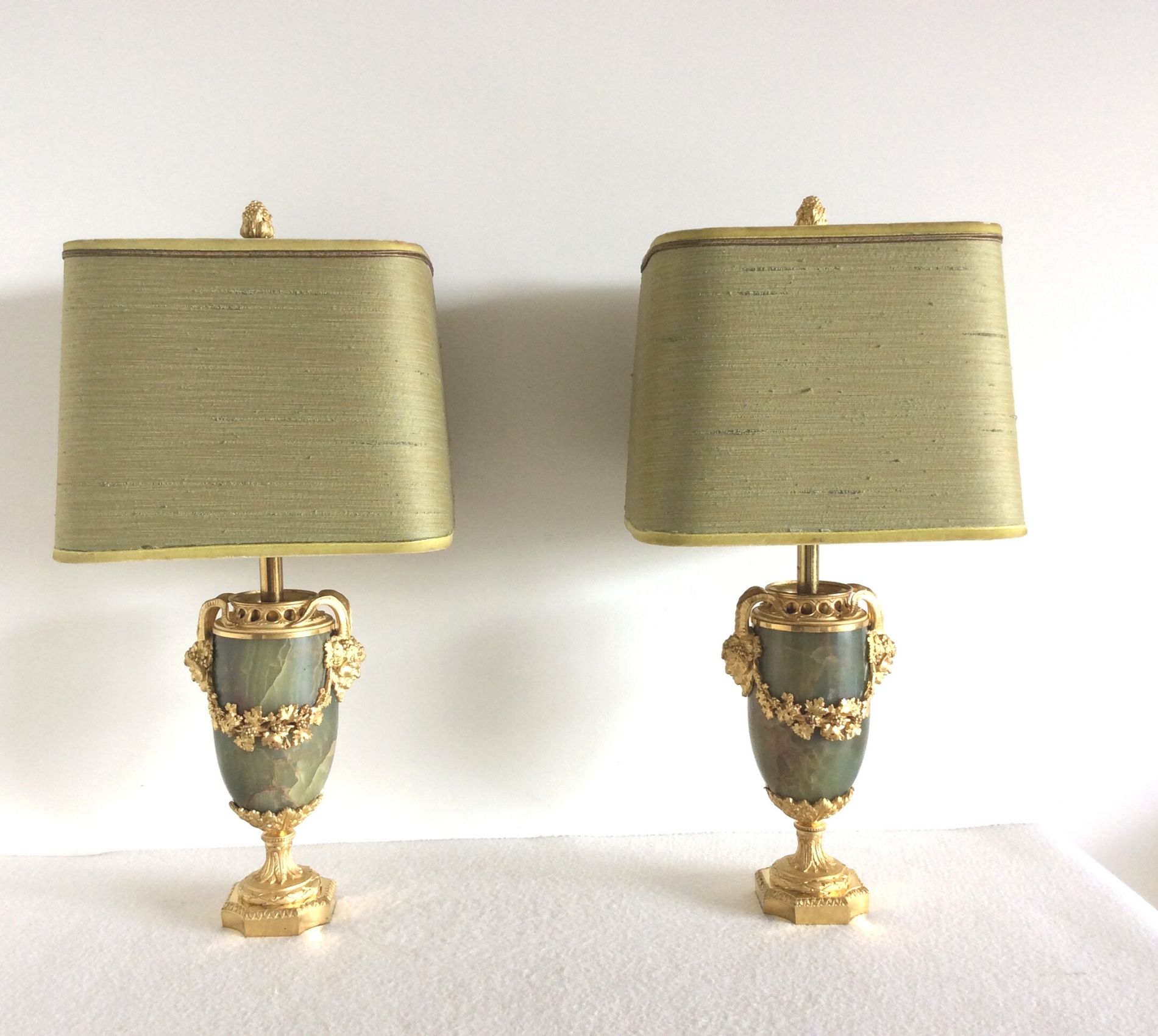 Pair of Louis XVI Style casseroles In Onyx Jasper and finely chiseled and gilded bronze mounts decorated with vine branches