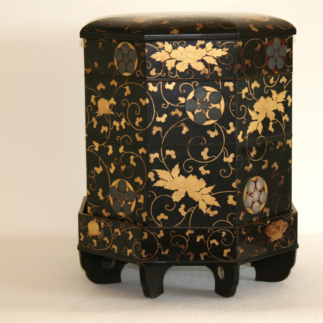 Hokkei de forme octogonale en laque brun, décoré en Hira Maki – e, de laque or et argent de pivoines et rinceaux et môn. L’intérieur de la base est en laque uni noire.