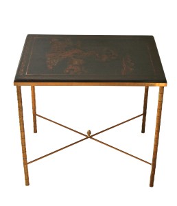 Boût de canapé attribué à la Maison Jansen, coiffé d’un plateau en laque Européenne à fond noir, à décor de paysage.