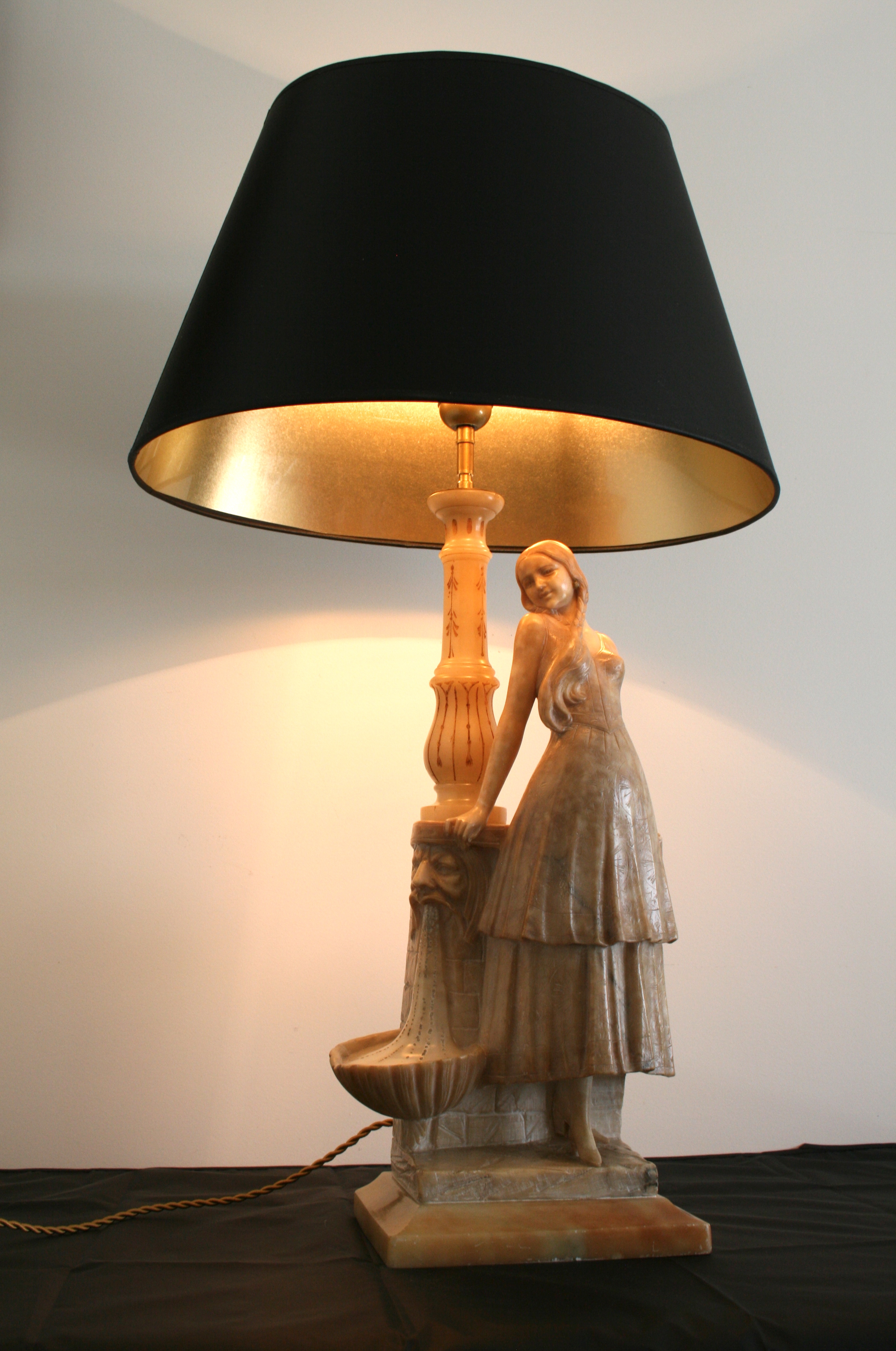 Sculpture en albâtre formant lampe, représentant une jeune femme nattée, se reposant sur une fontaine. Signée à l’arrière de LASCAUD.