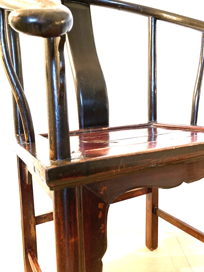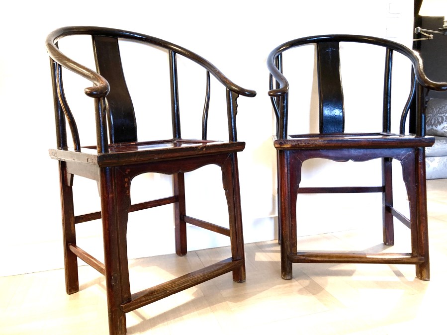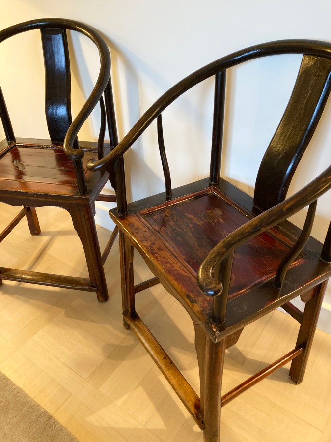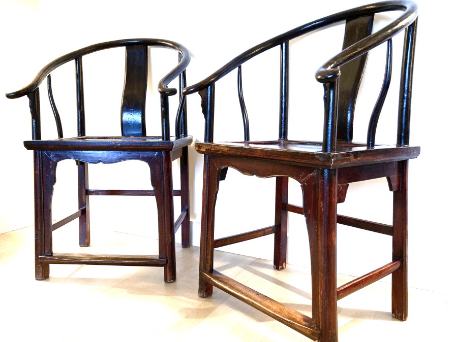 Paire de fauteuils chinois en bois de frêne ou d’orme à patine laquée brun rougeâtre d’origine. Dossier gondole. Traverse avant basse repose pieds.