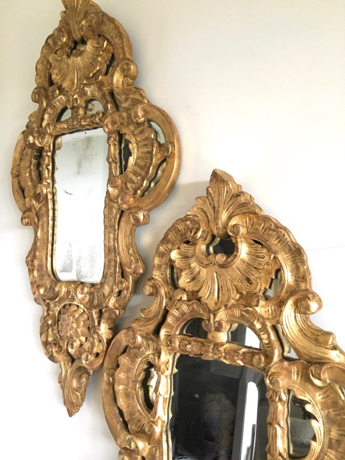 Paire de Grands Miroirs, en bois doré sculpté, Italie, 19ème »Rare paire de miroirs à pare-closes en bois sculpté et doré à la feuille. Dorure d’époque.