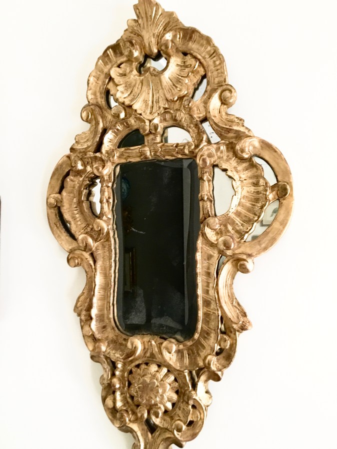 Le miroir central au mercure est biseauté. Belle sculpture à rinceaux, feuillages, guirlandes, coquille et fleurs de tournesol en partie basse.