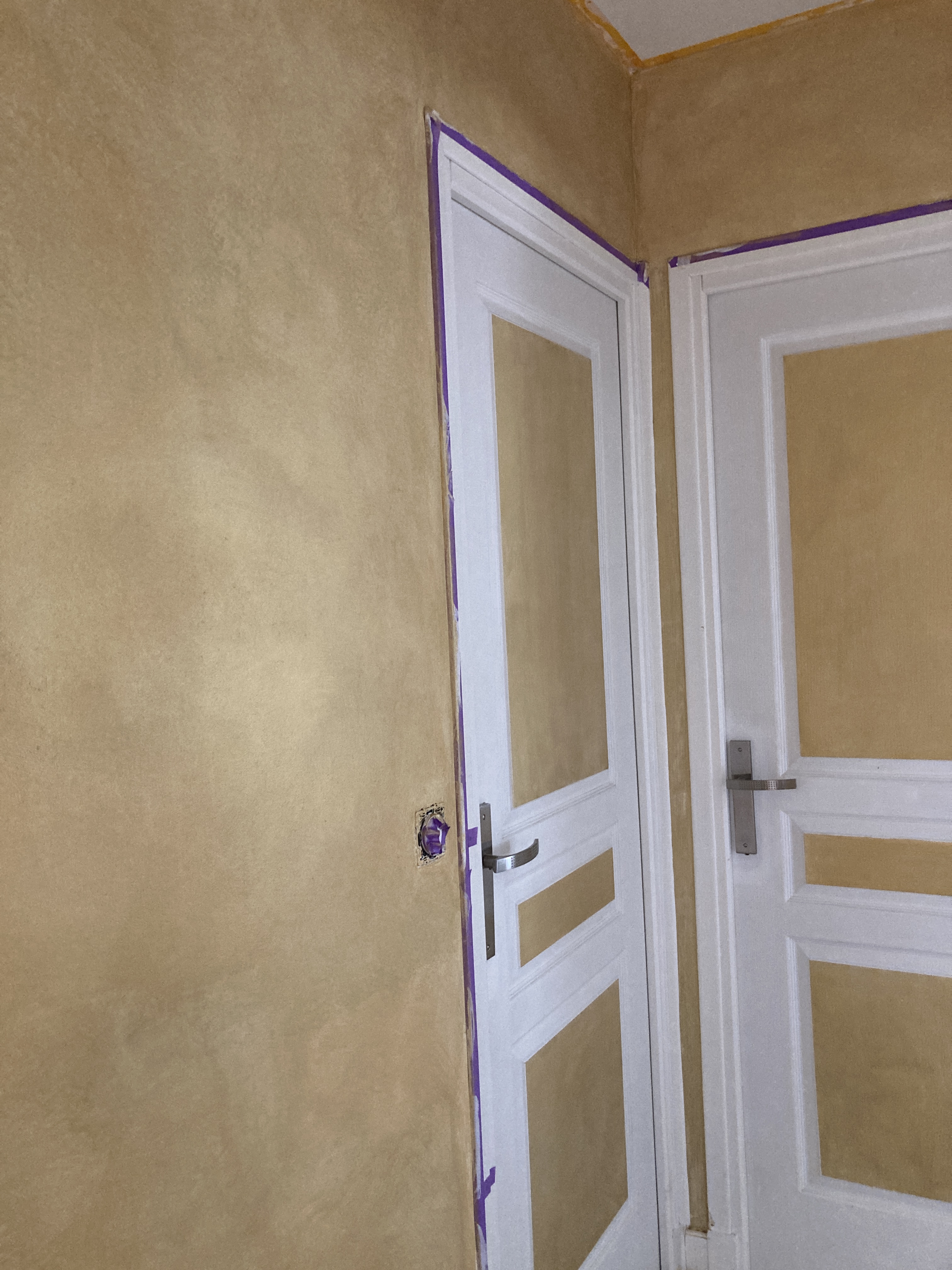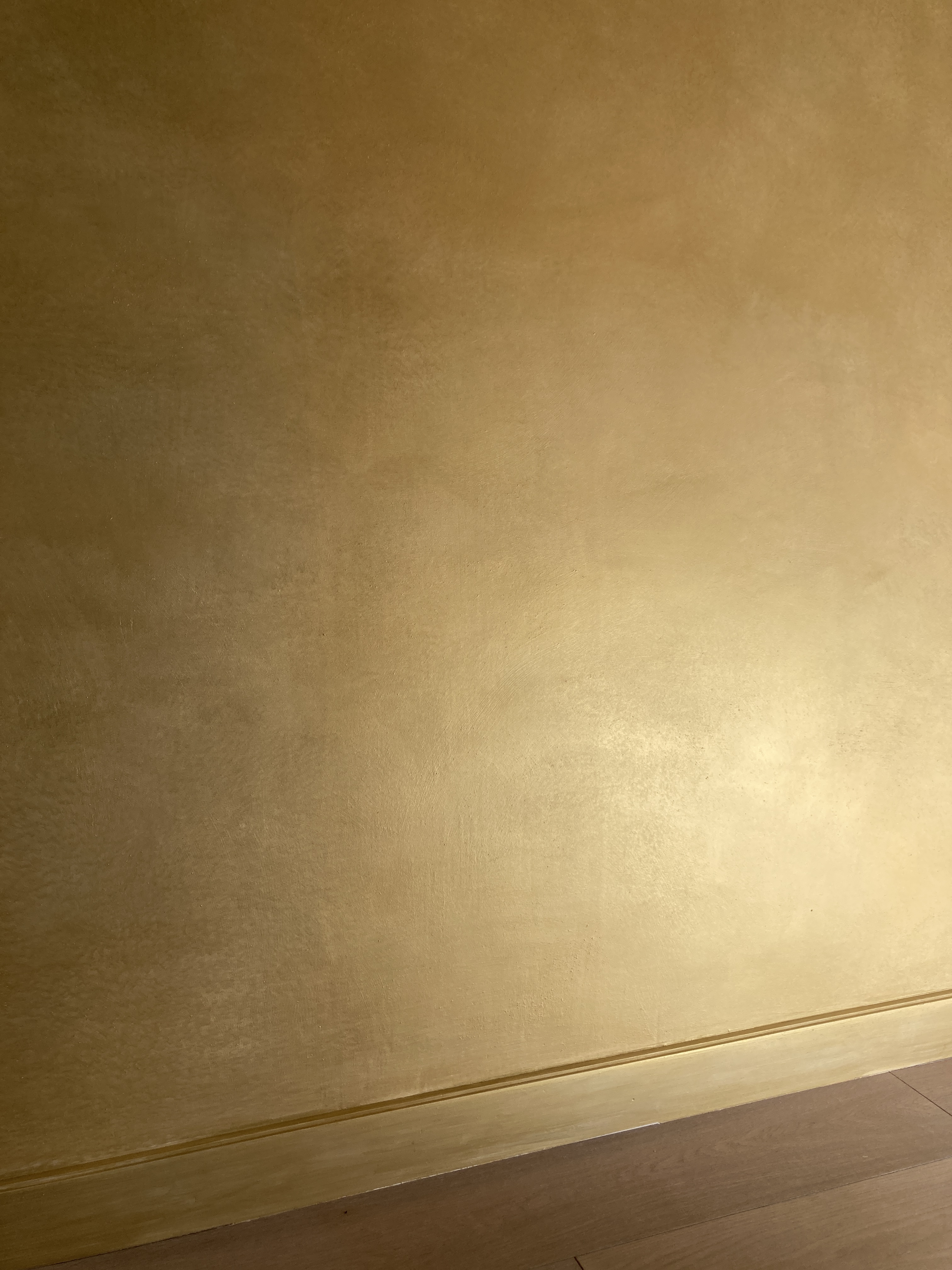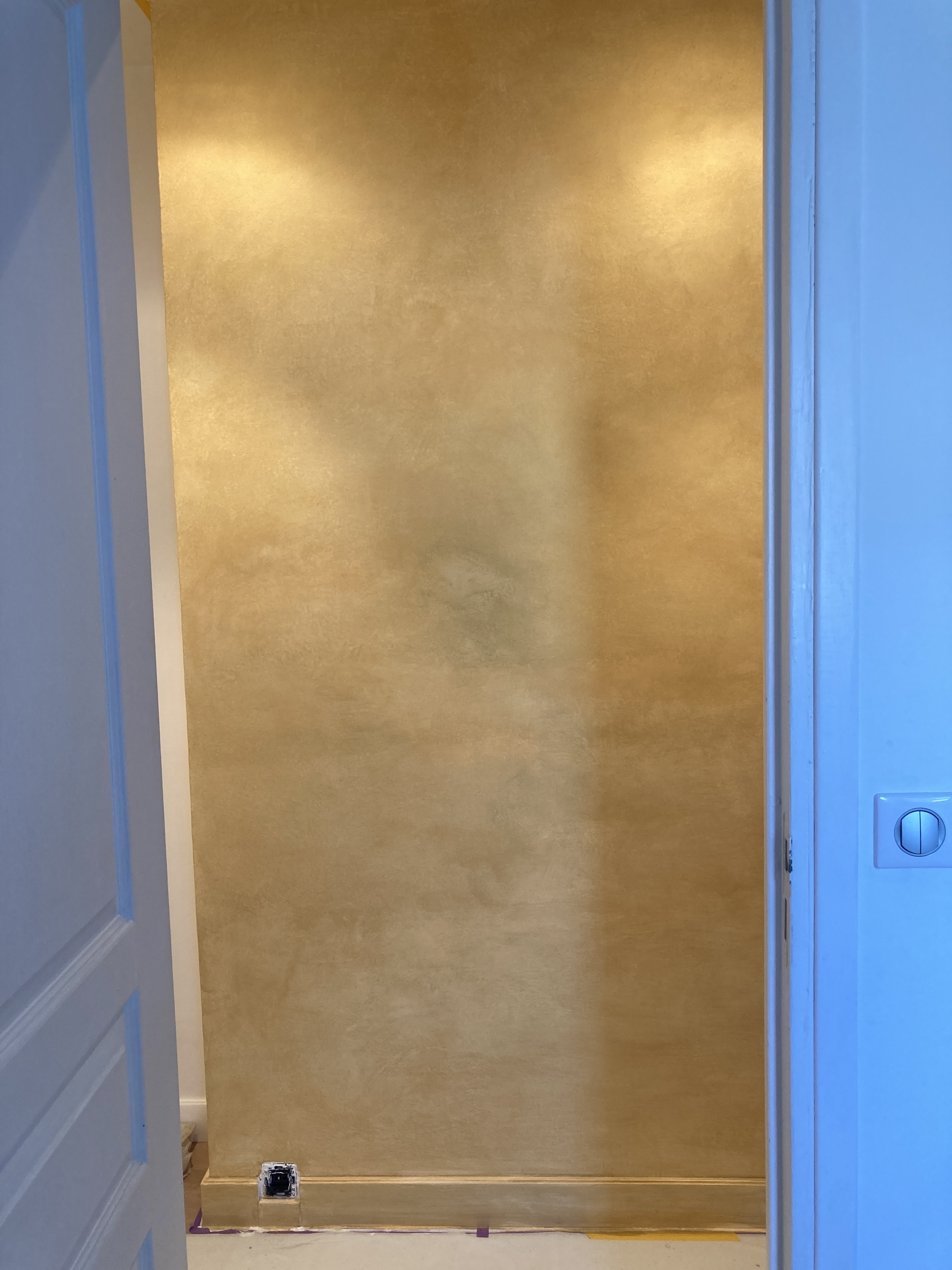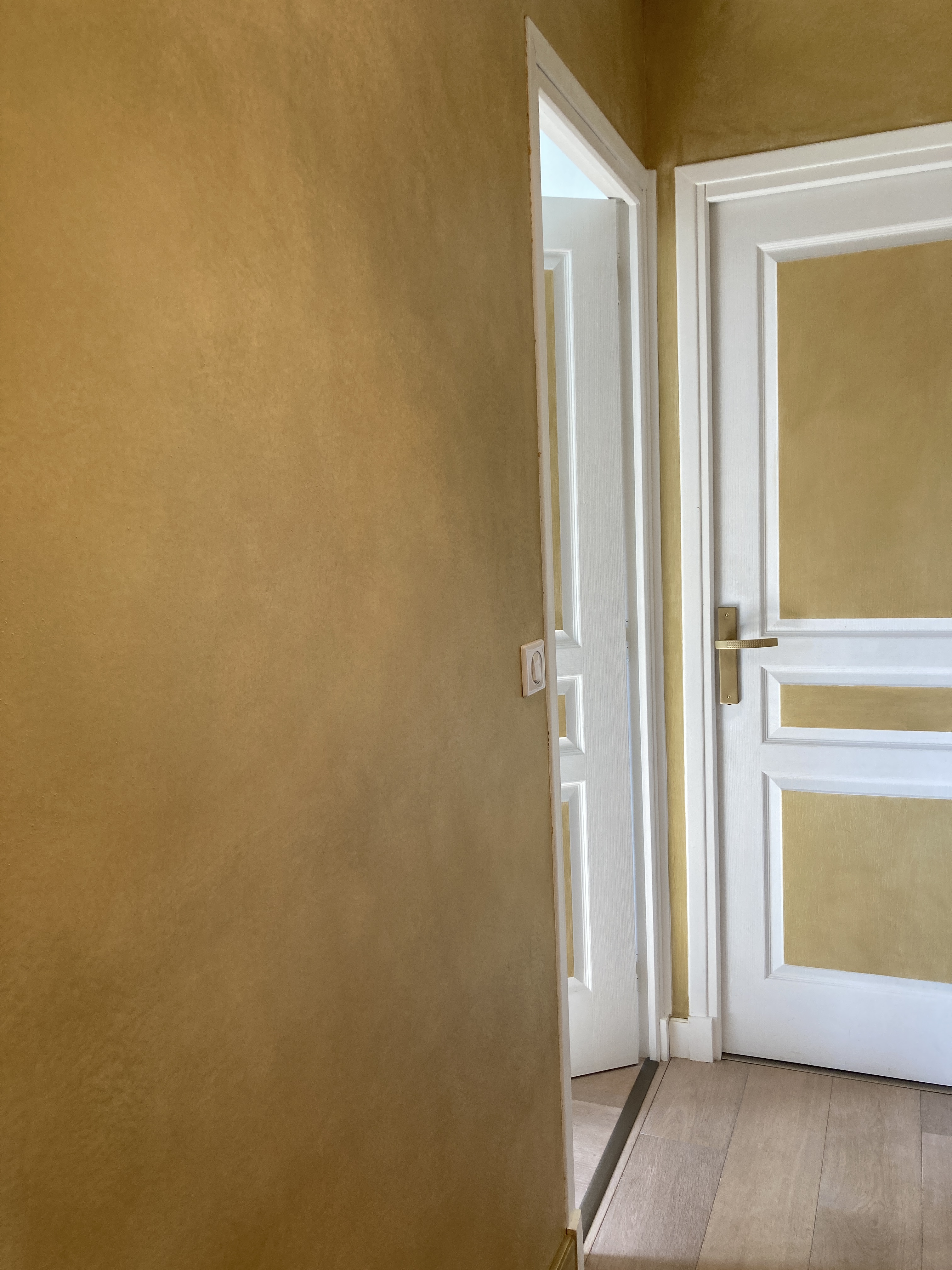 Après plusieurs propositions de patines murales colorées (pour palier à l’effet d’aplat d’un revêtement en peinture classique), notre cliente a opté pour une patine entièrement dorée pour le mur principal de son couloir, pour lui apporter du caractère, créer une ambiance plus chaleureuse, avec cette touche de sophistication.