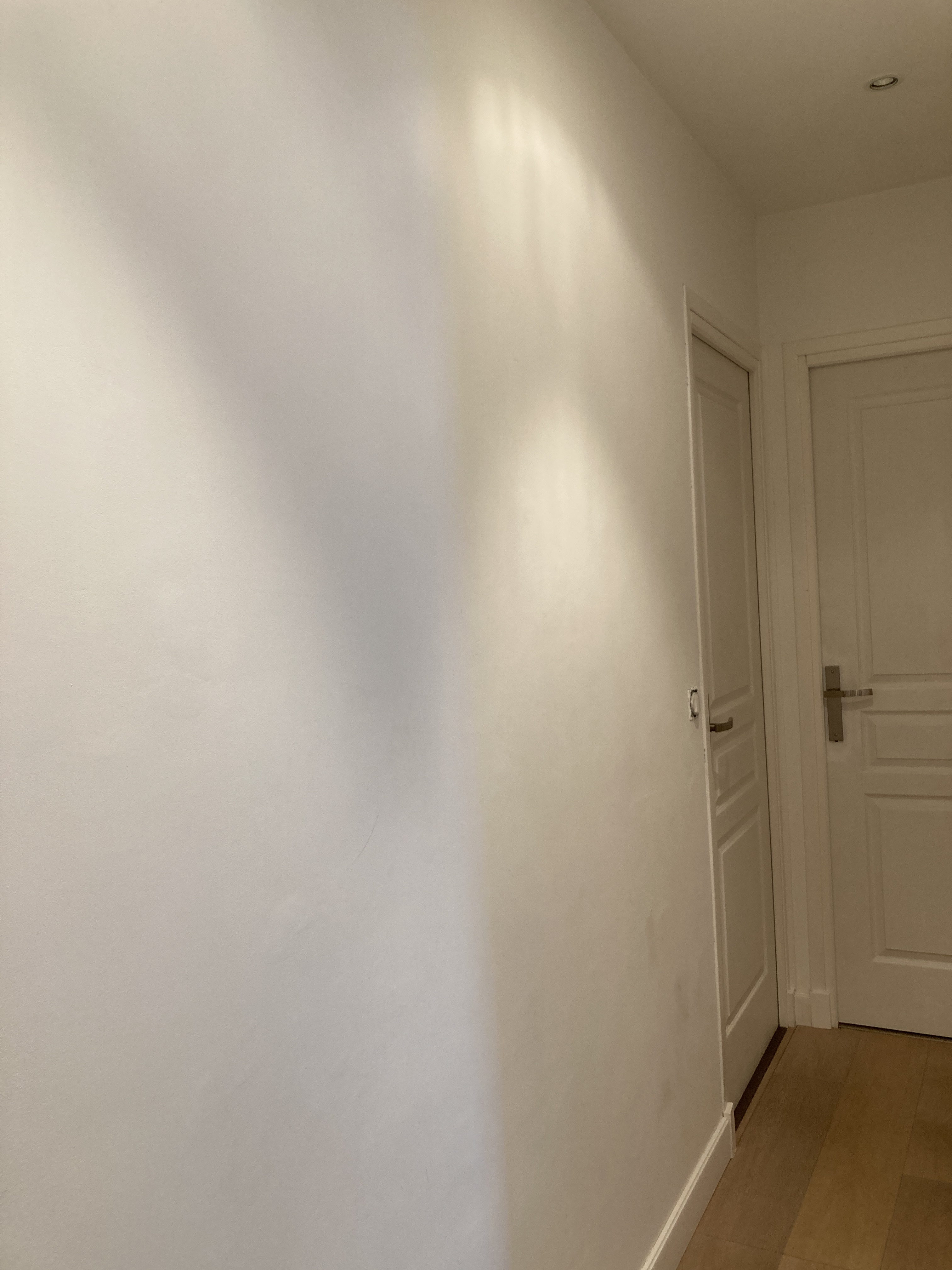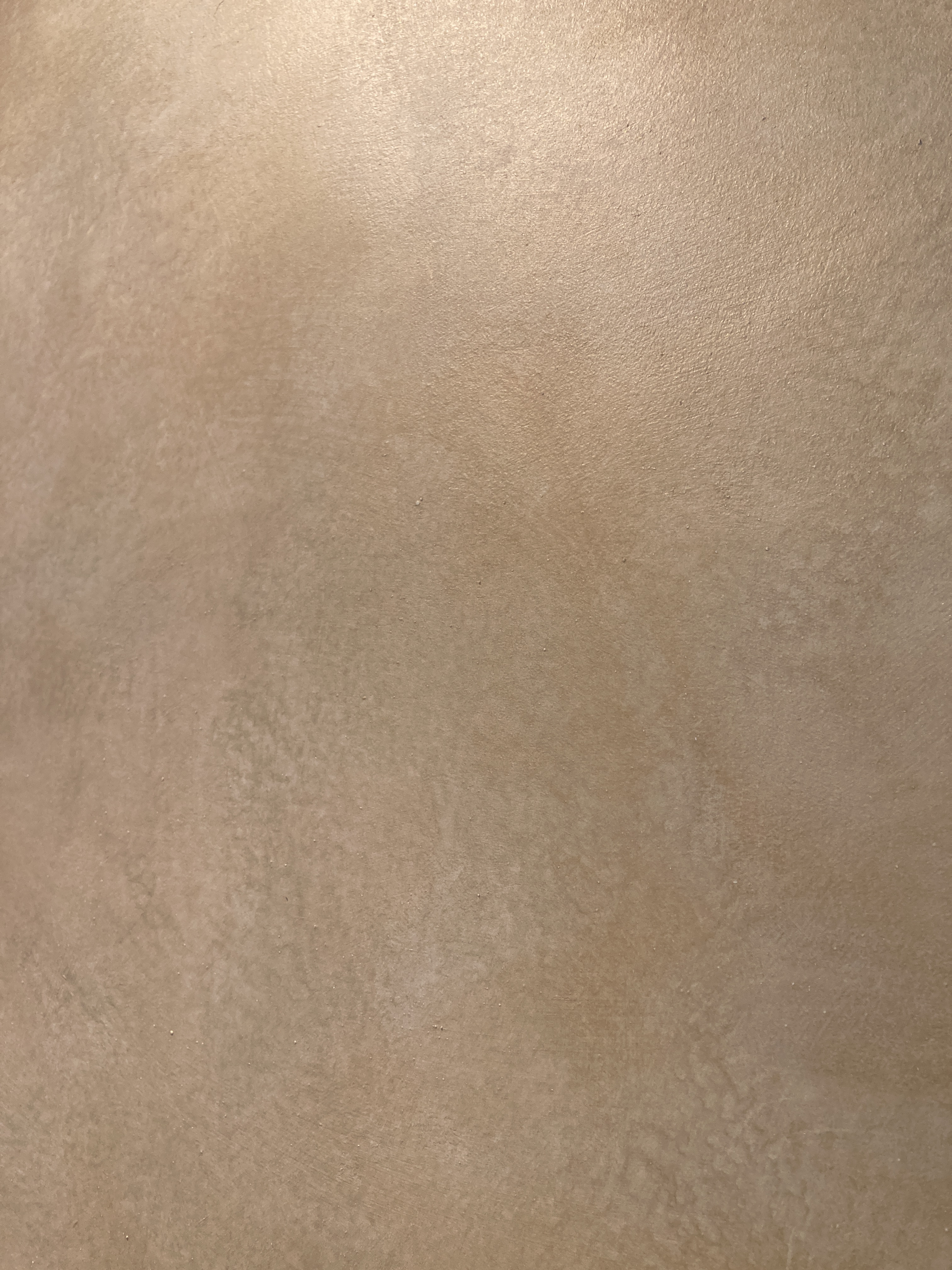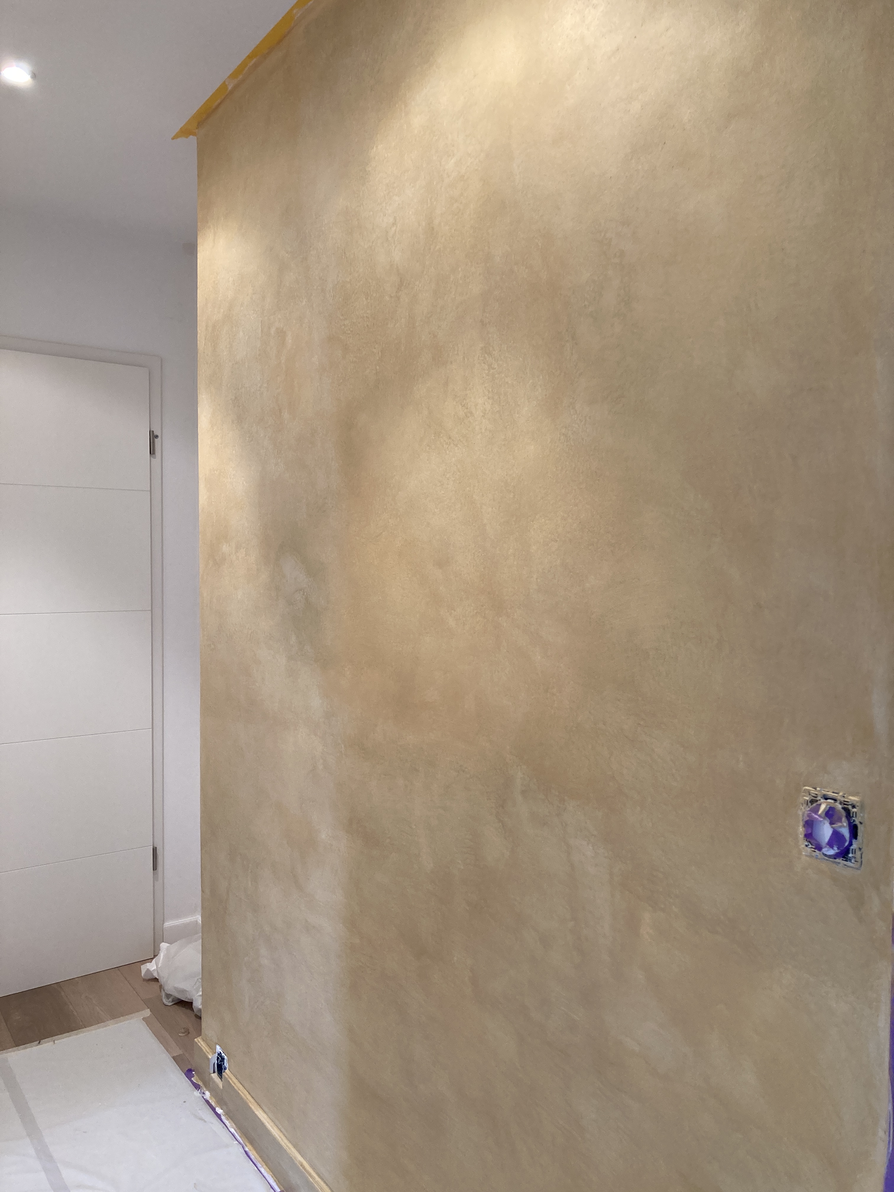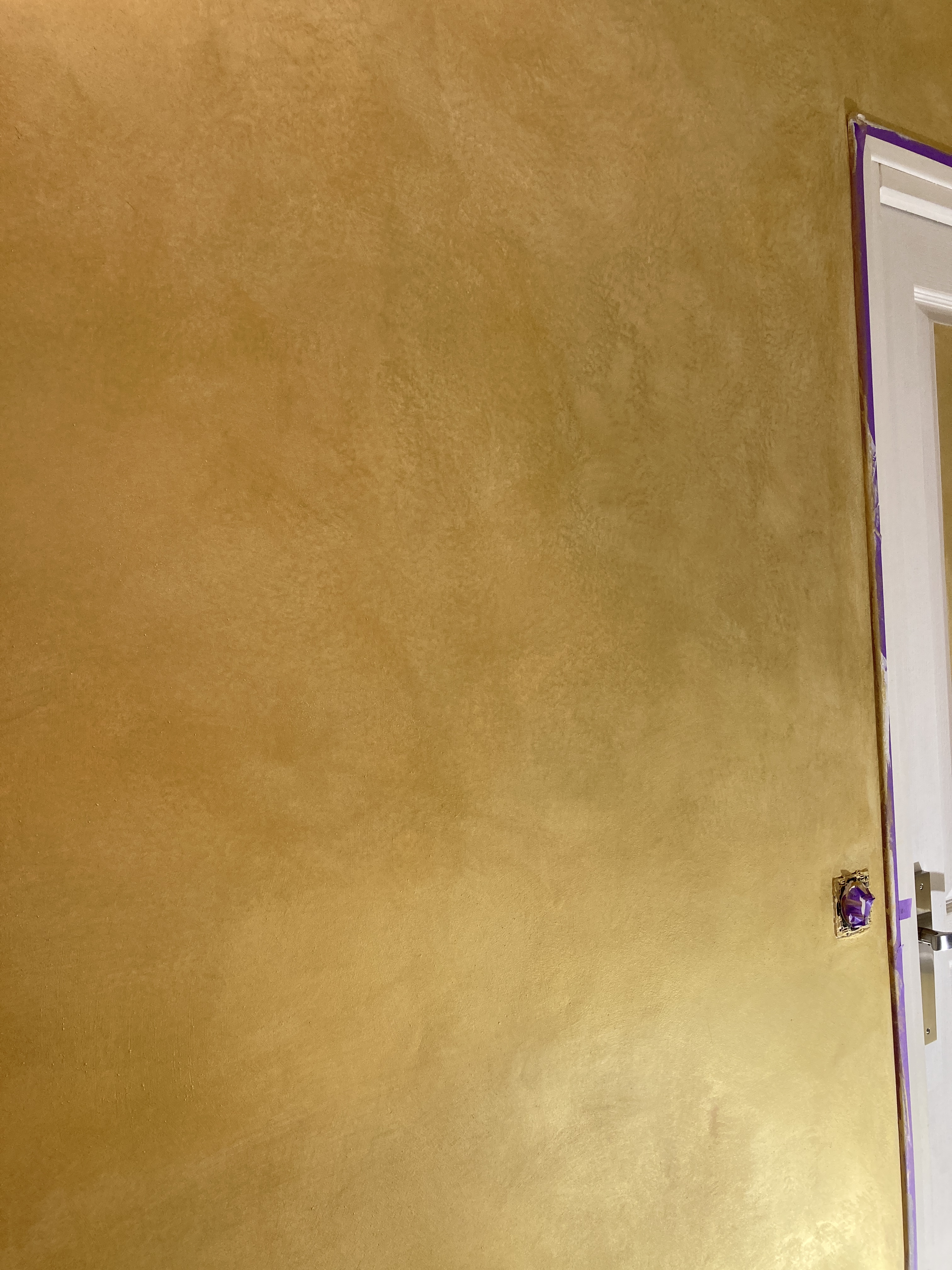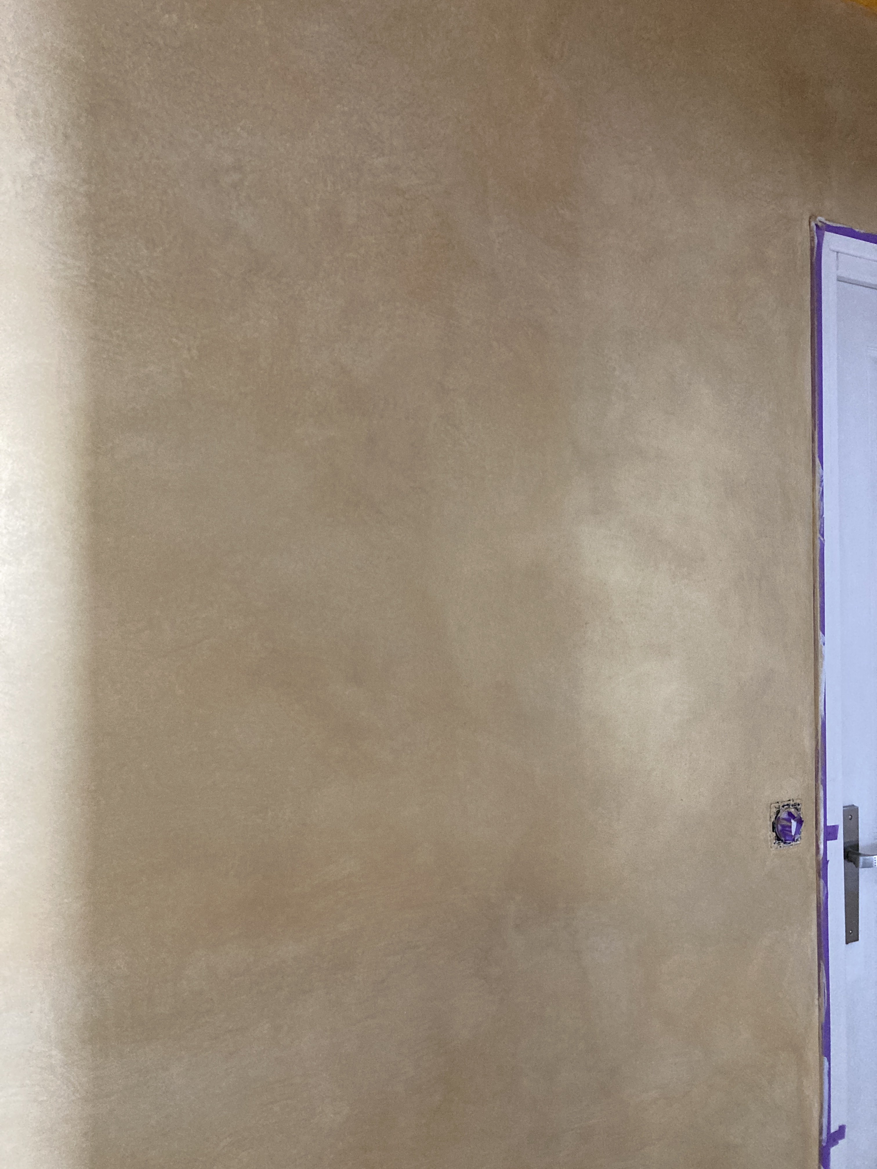 Après plusieurs propositions de patines murales colorées (pour palier à l’effet d’aplat d’un revêtement en peinture classique), notre cliente a opté pour une patine entièrement dorée pour le mur principal de son couloir, pour lui apporter du caractère, créer une ambiance plus chaleureuse, avec cette touche de sophistication.