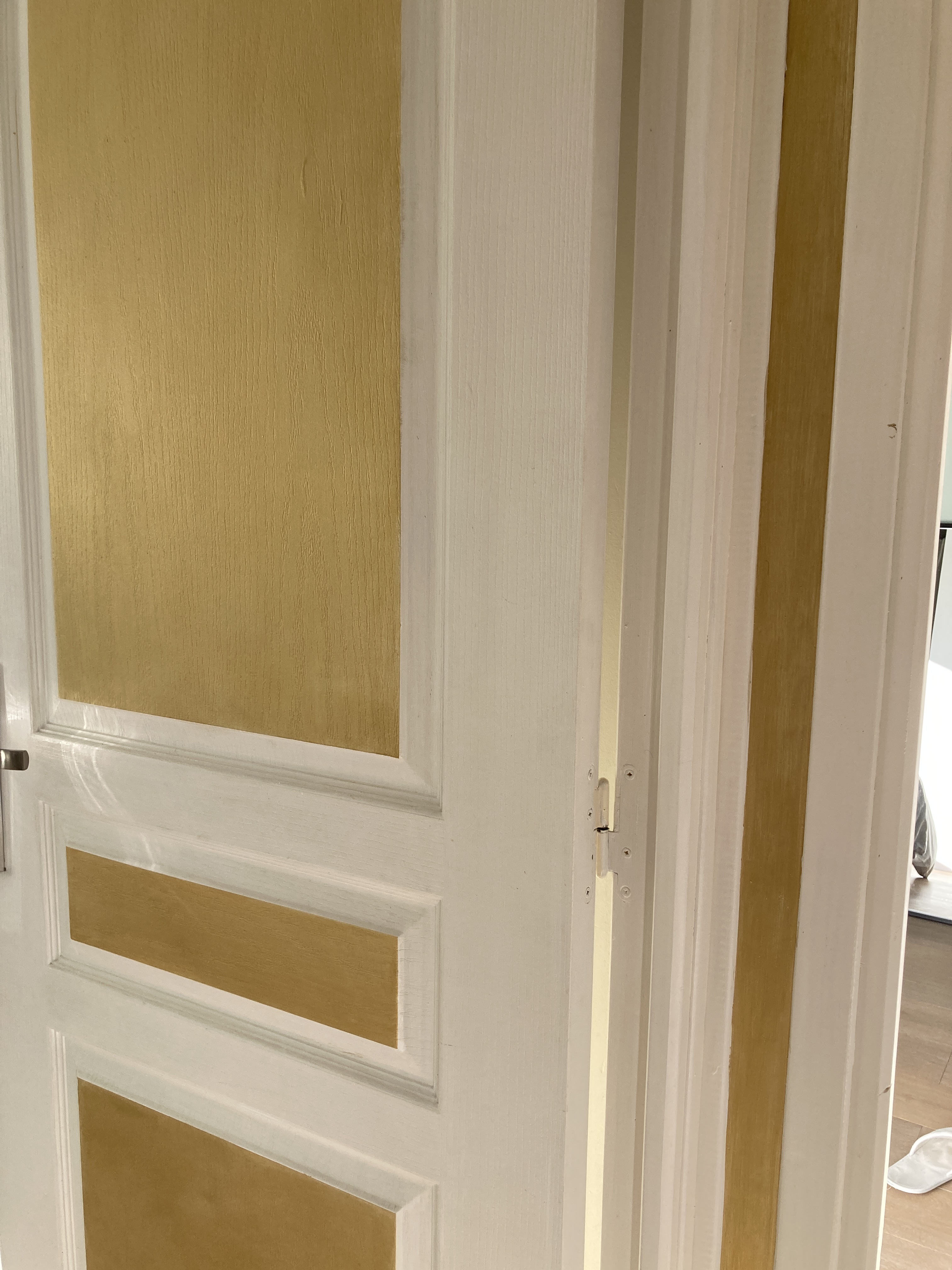 Cette technique peut être utilisée pour créer des accents dorés sur un mur entier ou pour ajouter des détails dorés à des éléments décoratifs tels que les moulures, les corniches, les plinthes, les poignées de porte…