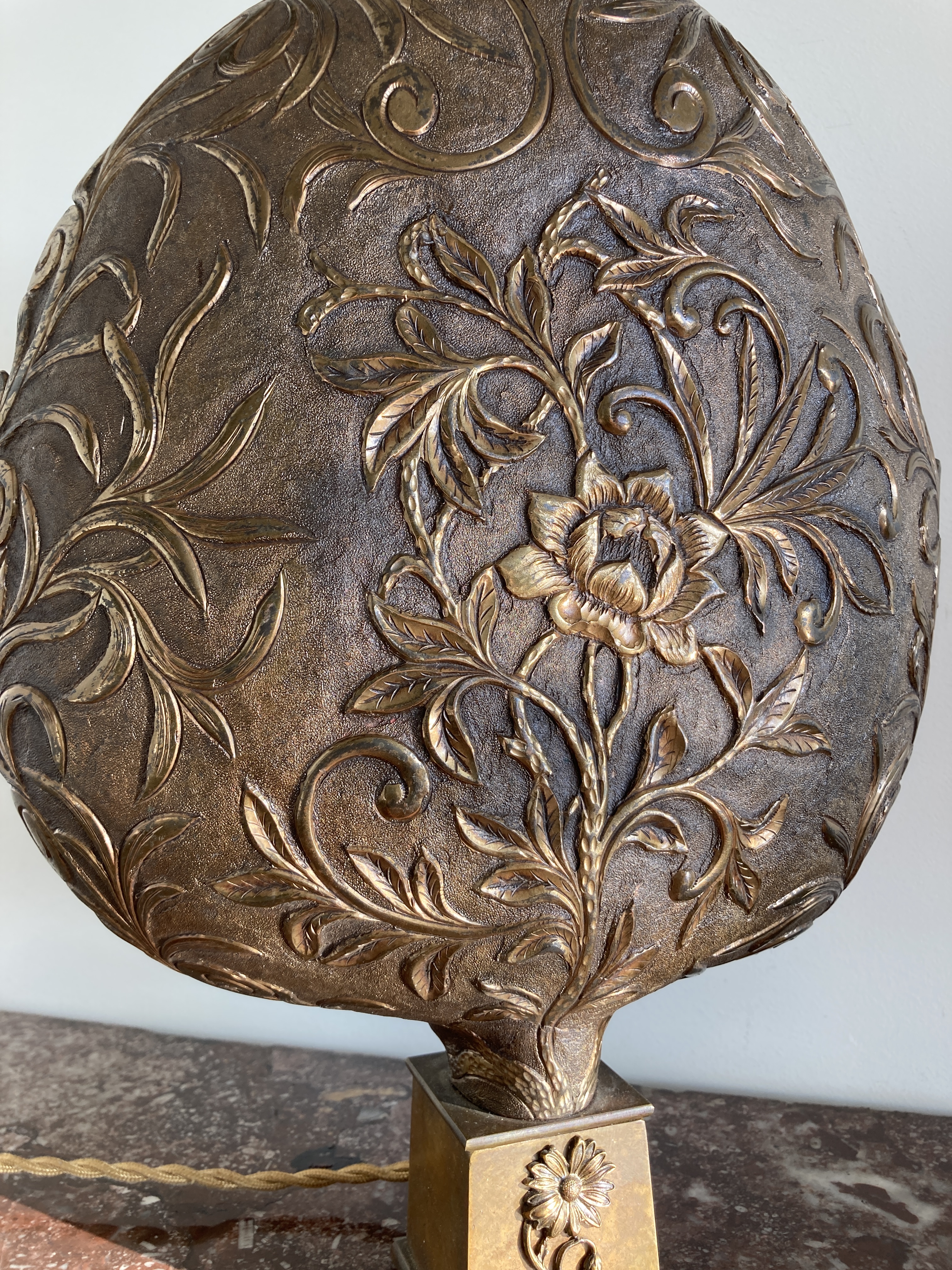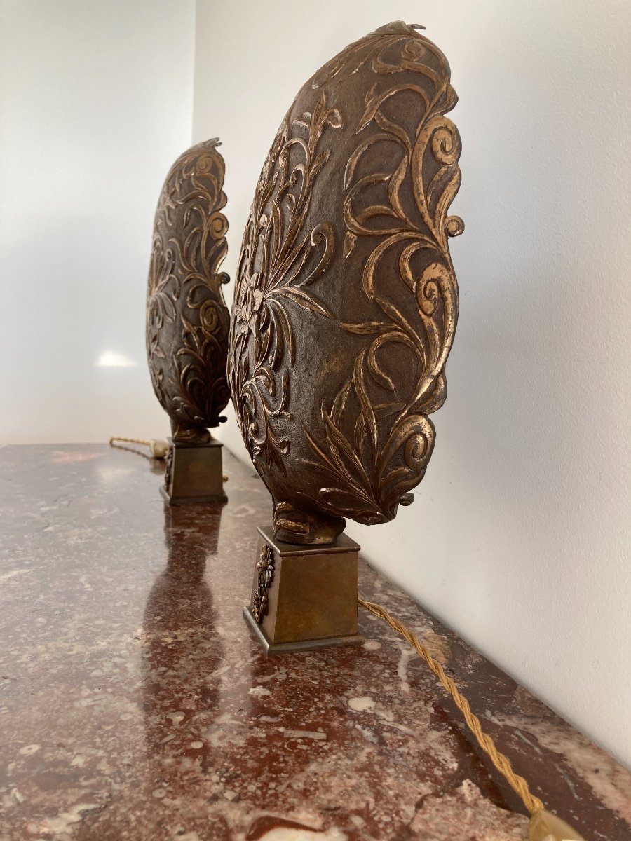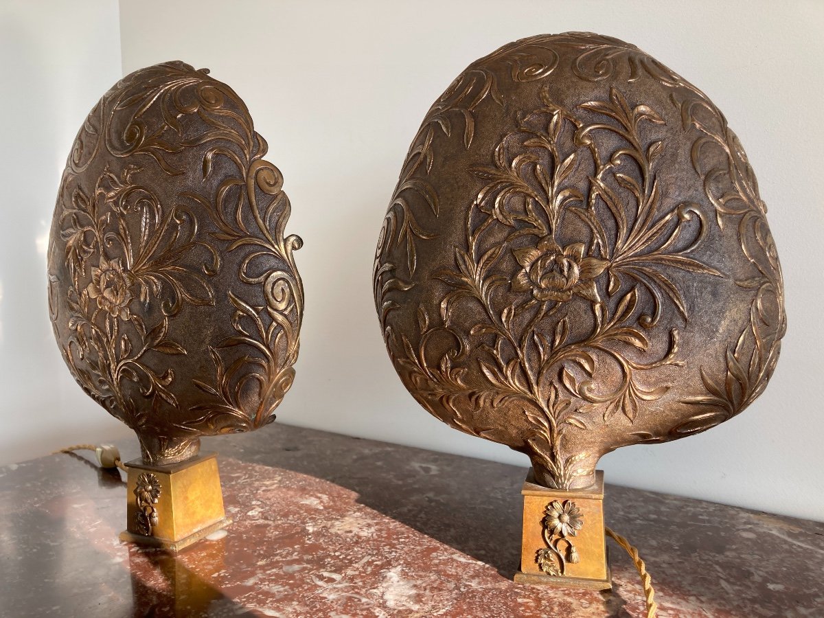 Paire de hauts de Palanquins en cuivre doré à décors floral et feuillage en forme de palme, montées à l’électricité sur un socle postérieur. VENDU