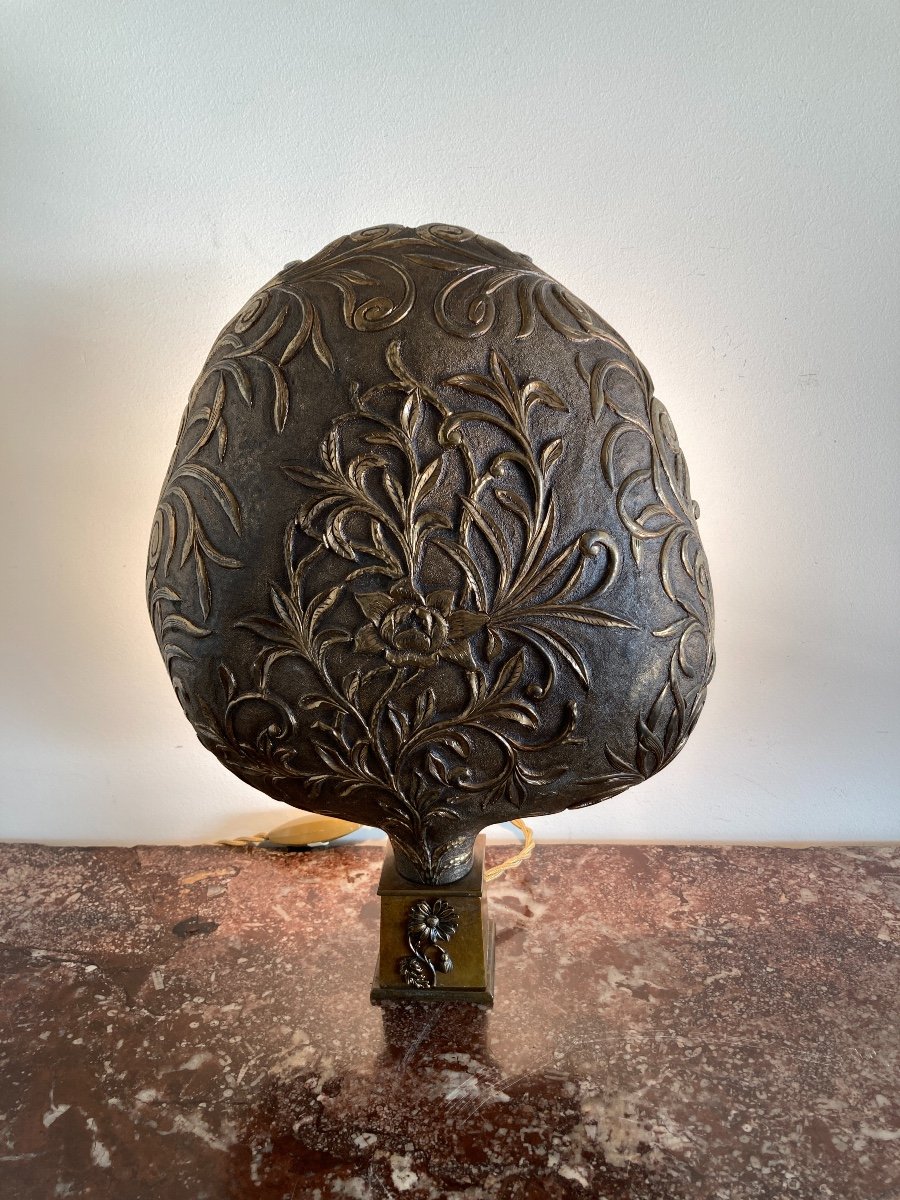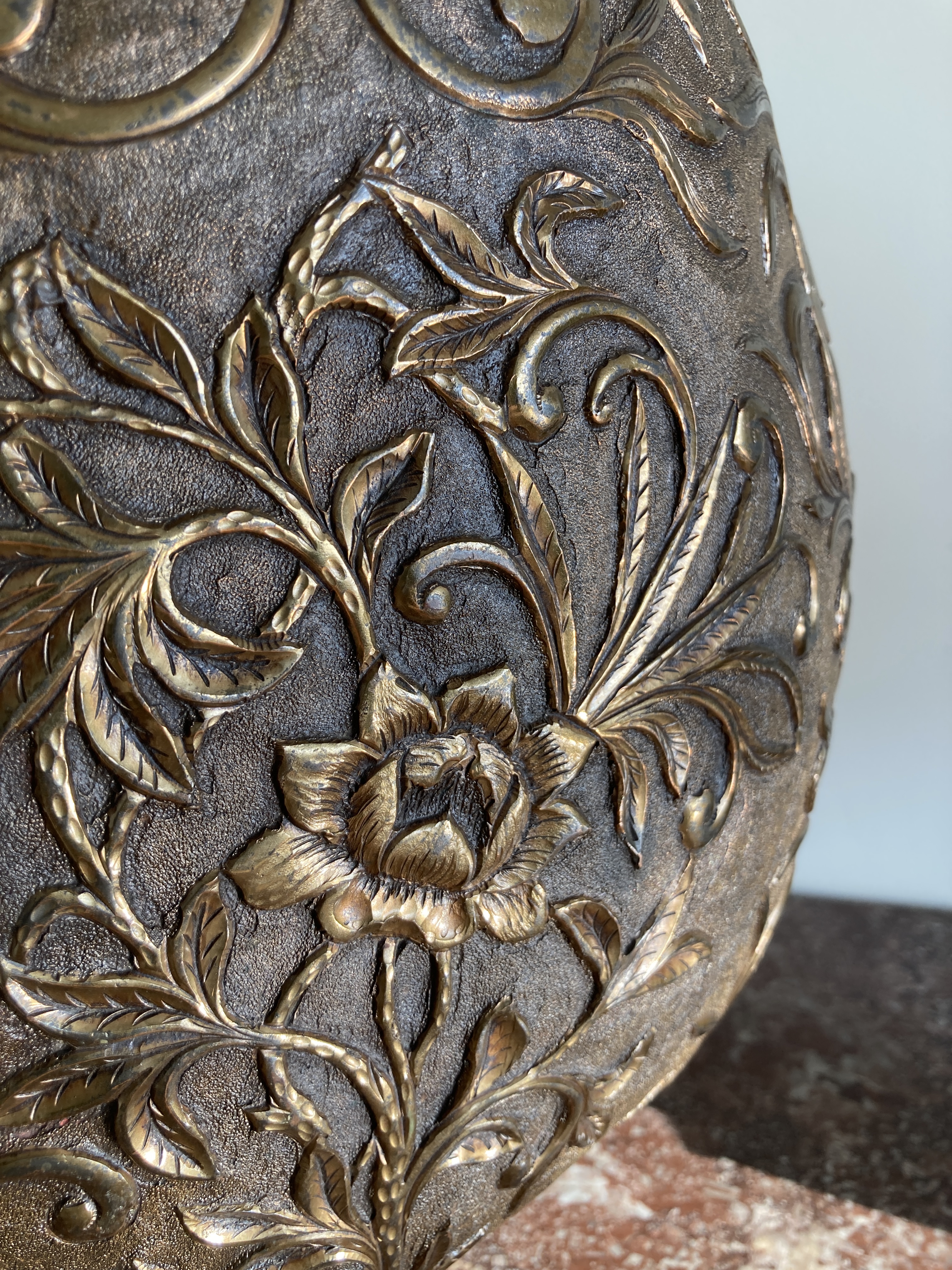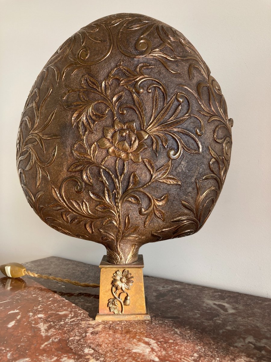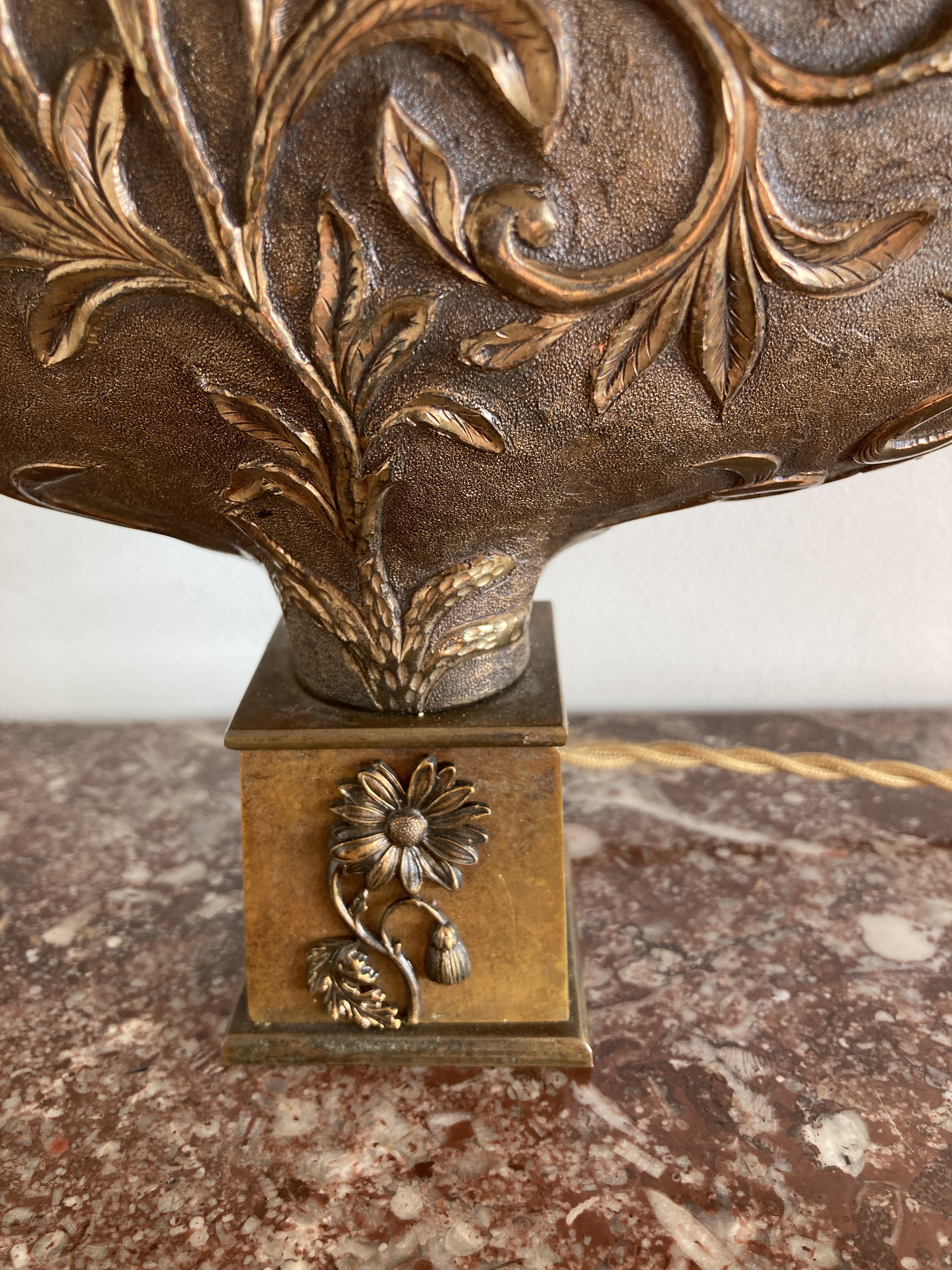 Paire de hauts de Palanquins en cuivre doré à décors floral et feuillage en forme de palme, montées à l’électricité sur un socle postérieur. VENDU