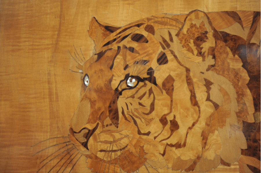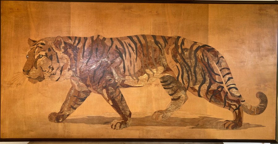 Grand panneau en marqueterie de bois exotique, Tigre du Benghale, signé Rosenau, vers 1930″Très grand panneau représentant un Tigre du Benghale.
