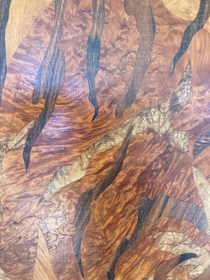 Exceptionnel travail de marqueterie en bois indigène et bois exotiques tels que : loupe et ronce de frêne, d’orme, tuya, érable moucheté, palissandre sur fond de sicomore.
