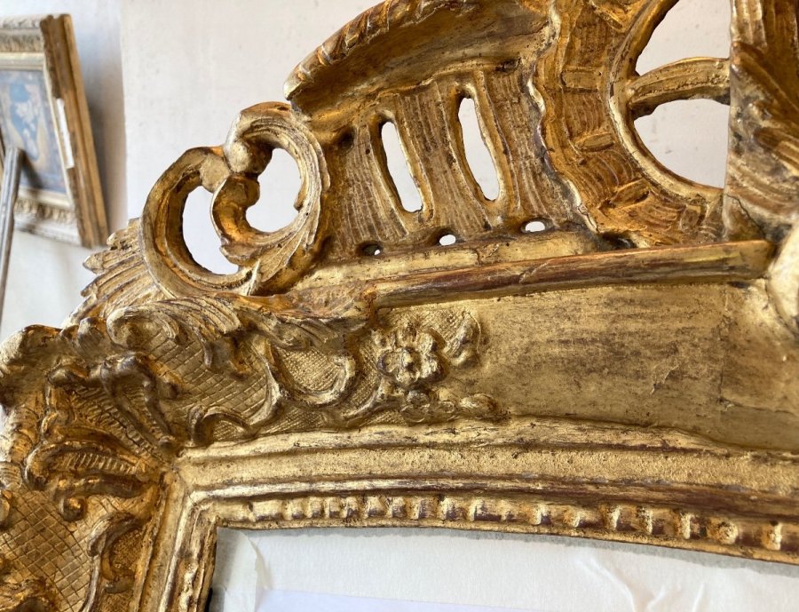 - Le miroir ancien de style Louis XIV ou de style baroque voit son cadre s’enrichir d’ornement en bois sculpté et doré. Plusieurs nouveaux matériaux apparaissent, notamment le laiton.