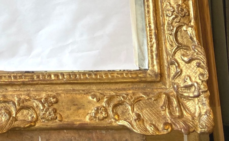 Le fronton cintré richement sculpté d’une coquille ajourée sur toute la largeur et entourée d’enroulements de feuillages. Cadre extérieur à riche ornementation de coquilles latérales à fleurettes. Les angles ornés d’écoinçons à feuillages et fleurs.