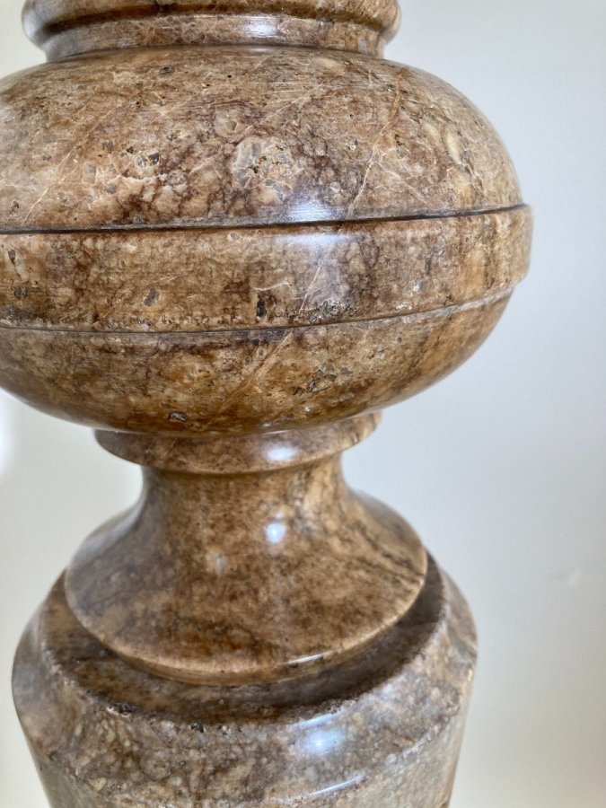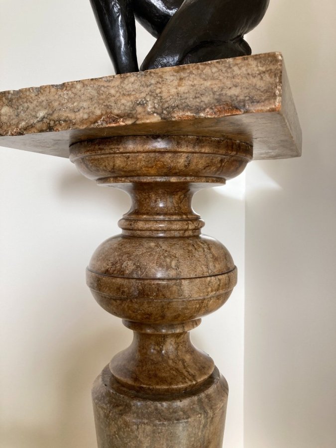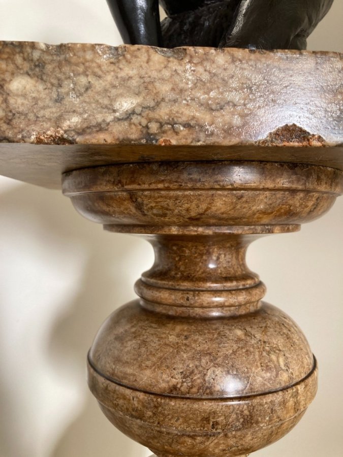 Une colonne de présentation à dessus pivotant en marbre de Sarrancolin.Travail fin 18ème, début 19ème. Se composant d’une colonne fuselée aux larges cannelures, reposant sur une base ronde moulurée en doucine et contre socle quadrangulaire mouluré à gorges.Patine d’époque.