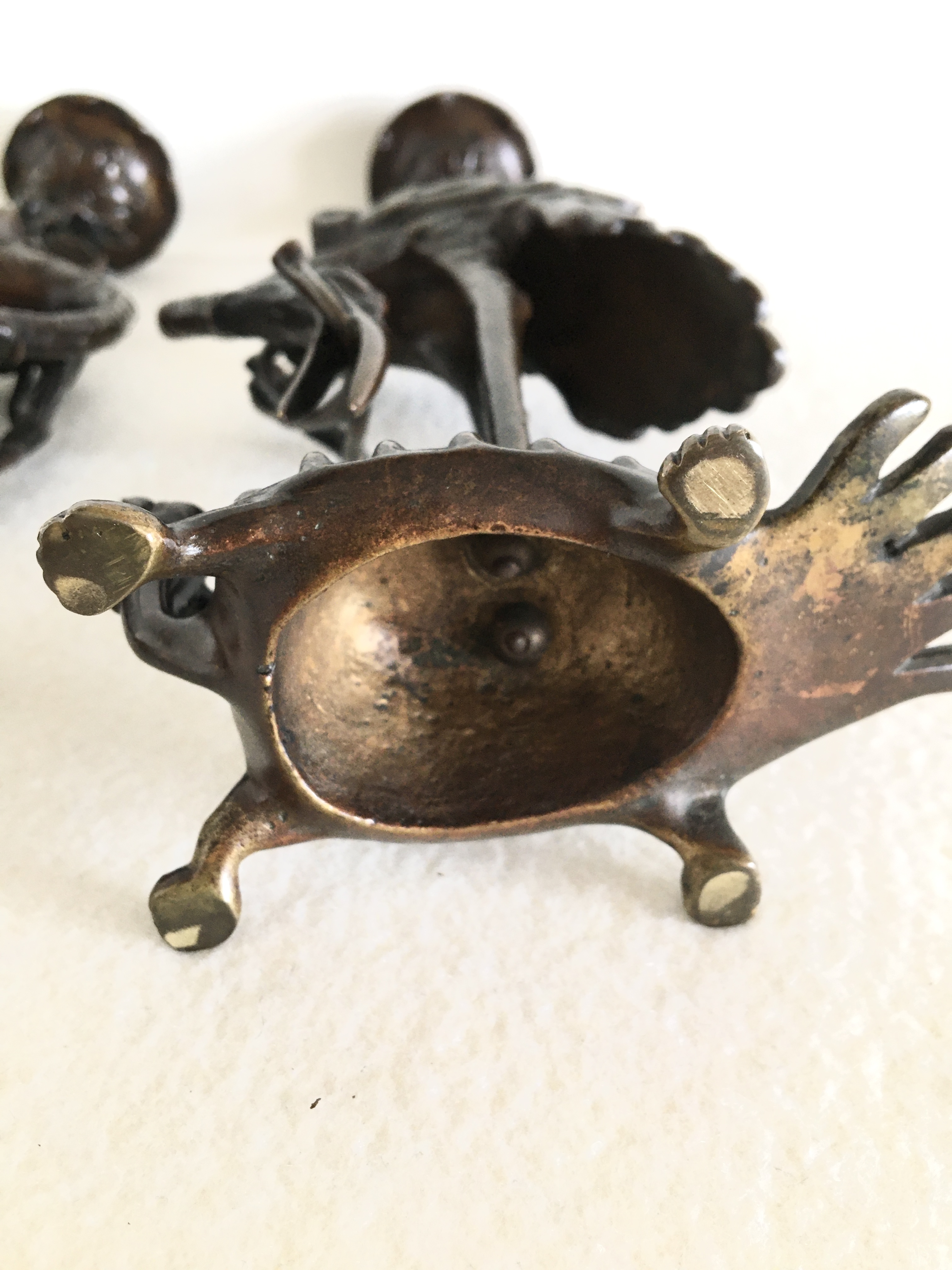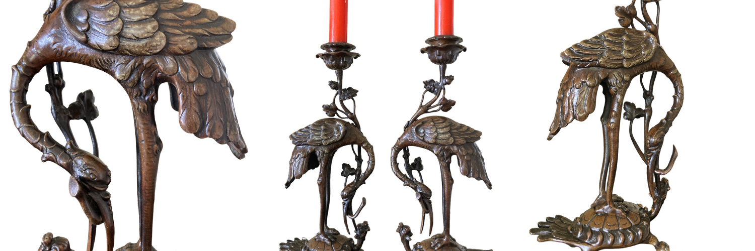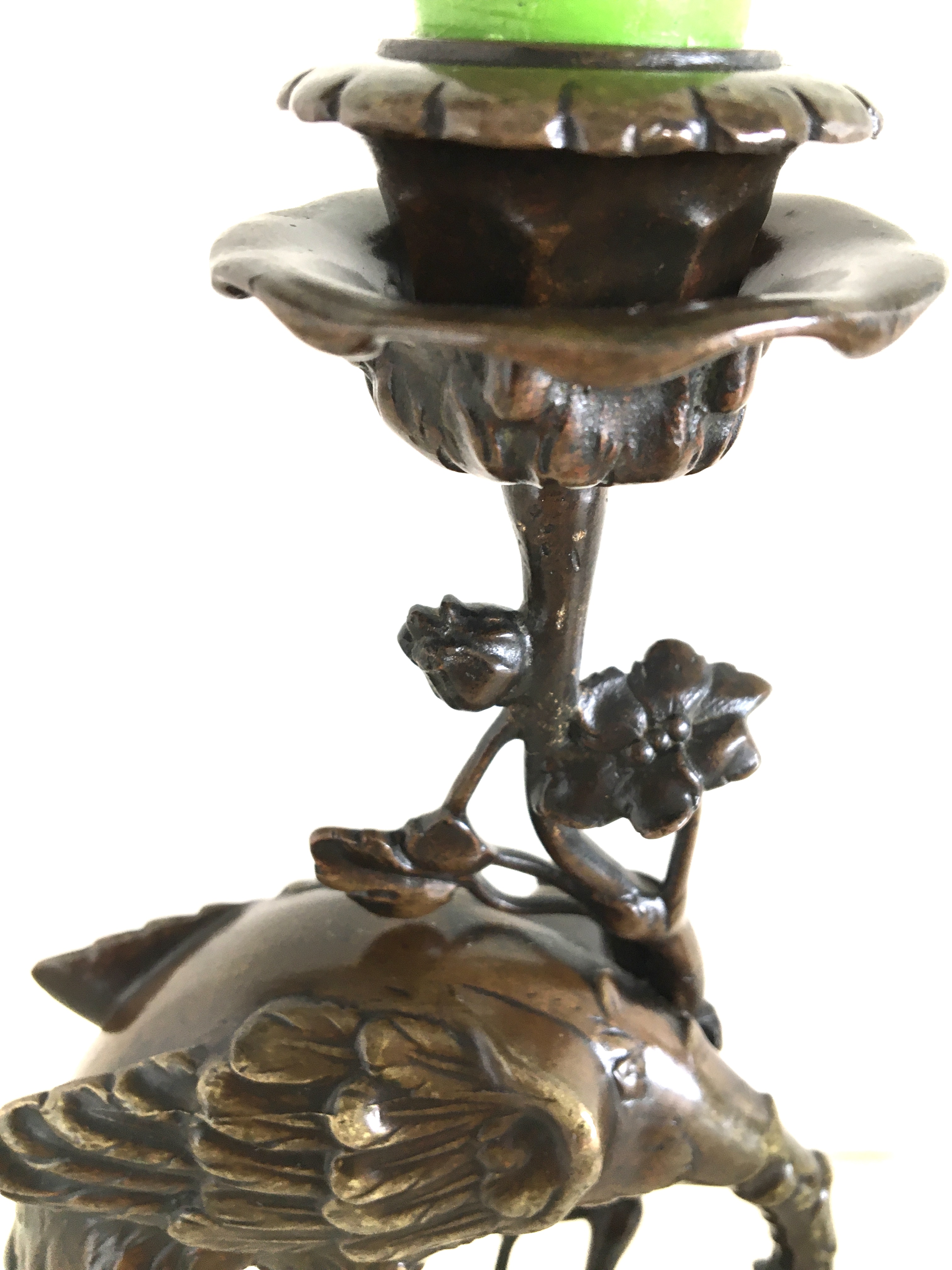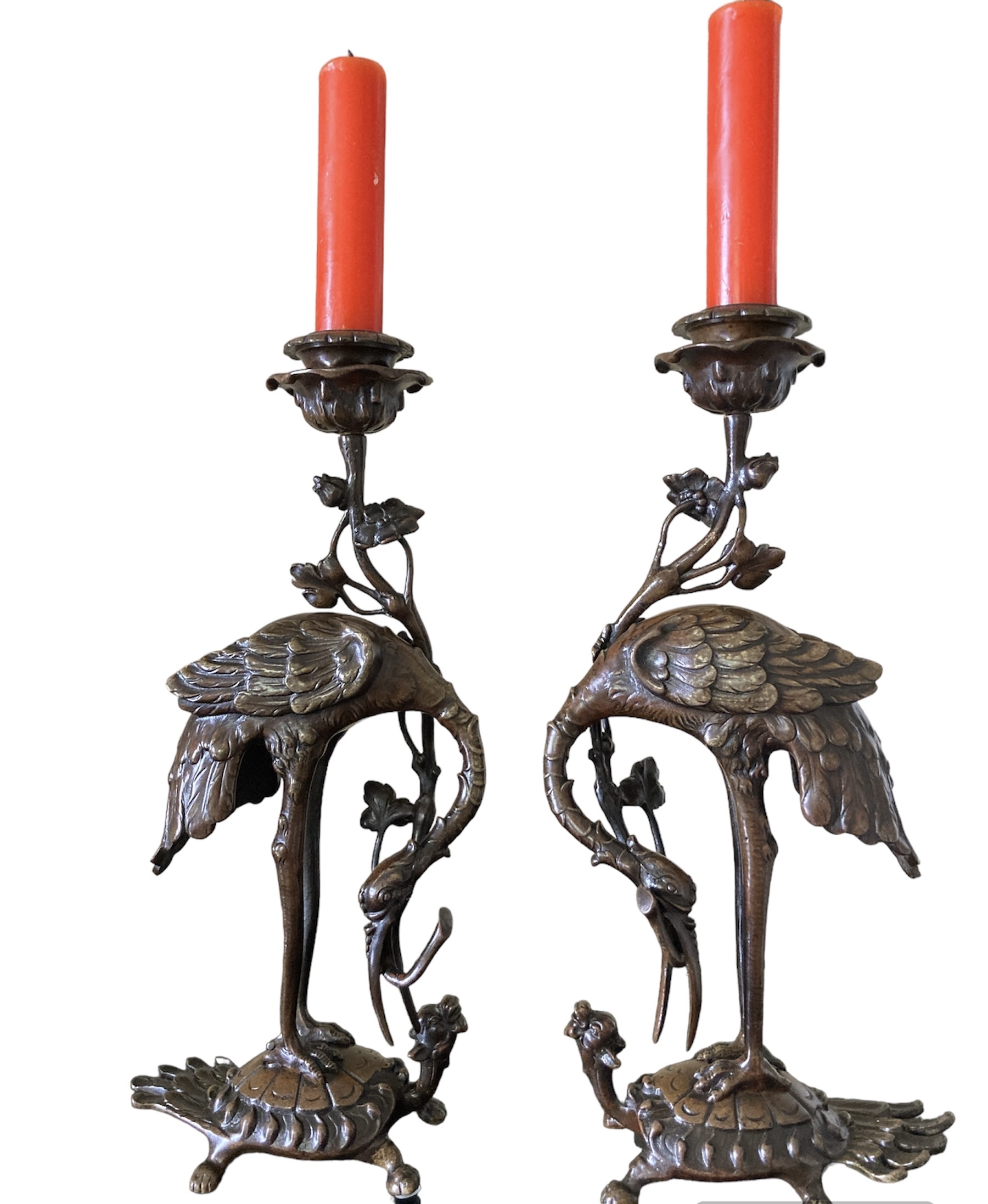 Paire de bougeoirs en bronze ciselé et patiné, représentant des échassiers grues du Japon (symbole de longévité), surmontant des tortues d’eau et tenant en leur bec un branchage fleuri.Très belle ciselure.