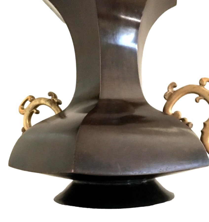 Grand vase Japonais d’époque Meiji (1868-1912), en bronze à très belle patine brune. De forme hexagonale à pans coupés et large panse. Agrémenté de deux prises latérales en bronze simulant des branchages stylisés.