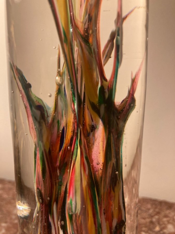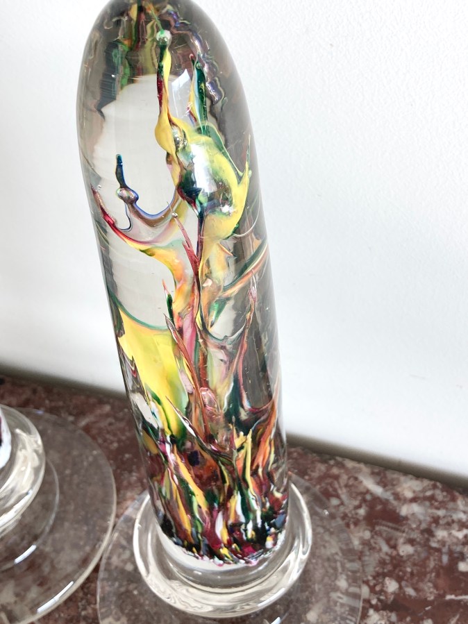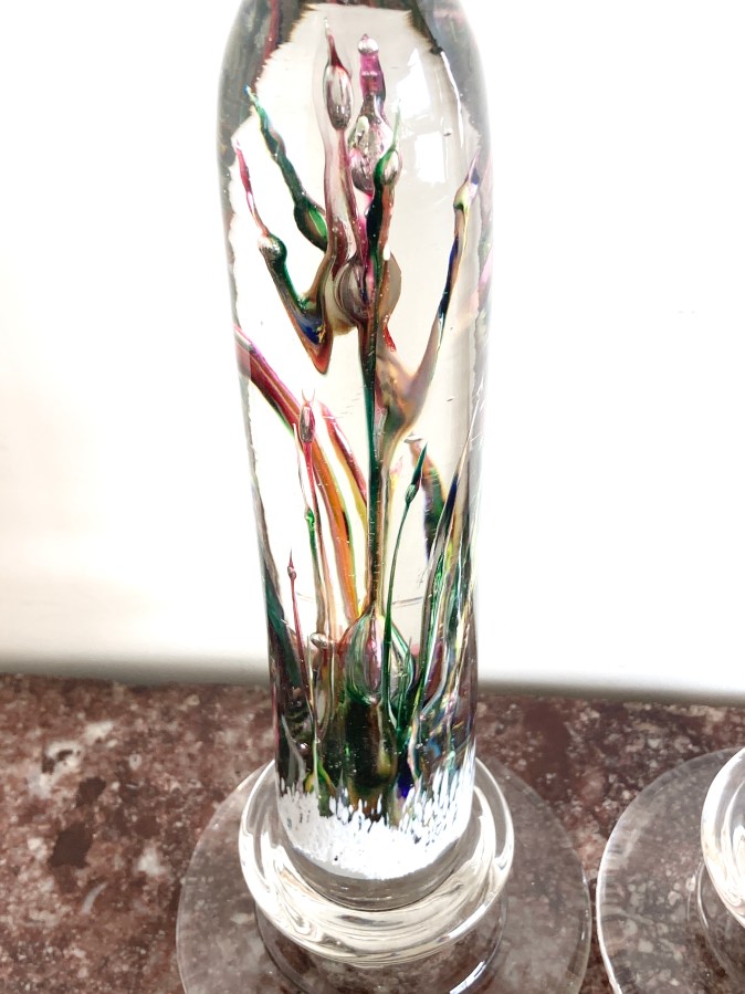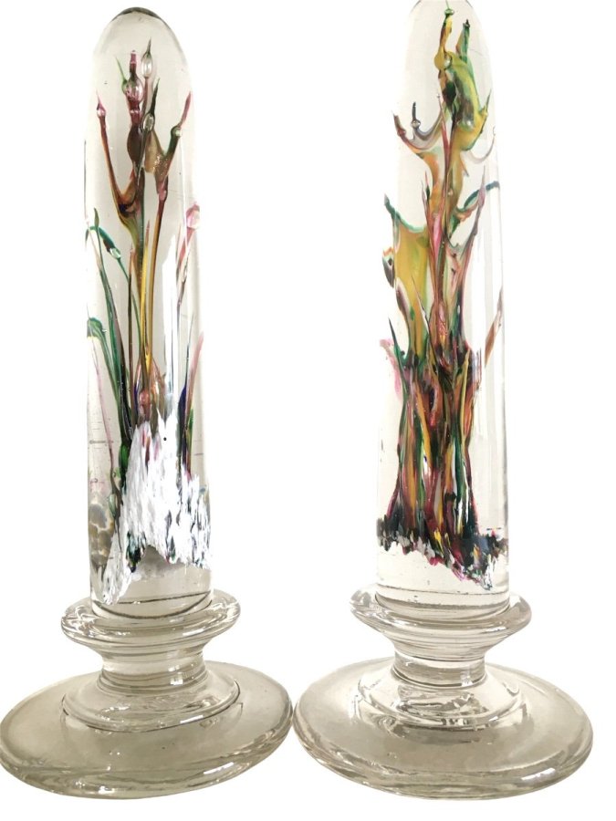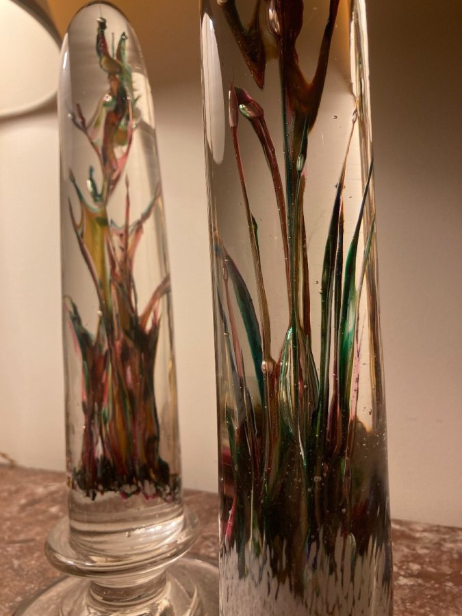 Paire de colonnes de forme ogivale. Sulfures avec inclusions de couleurs en verre cristal. Provenance verrerie de Vierzon.