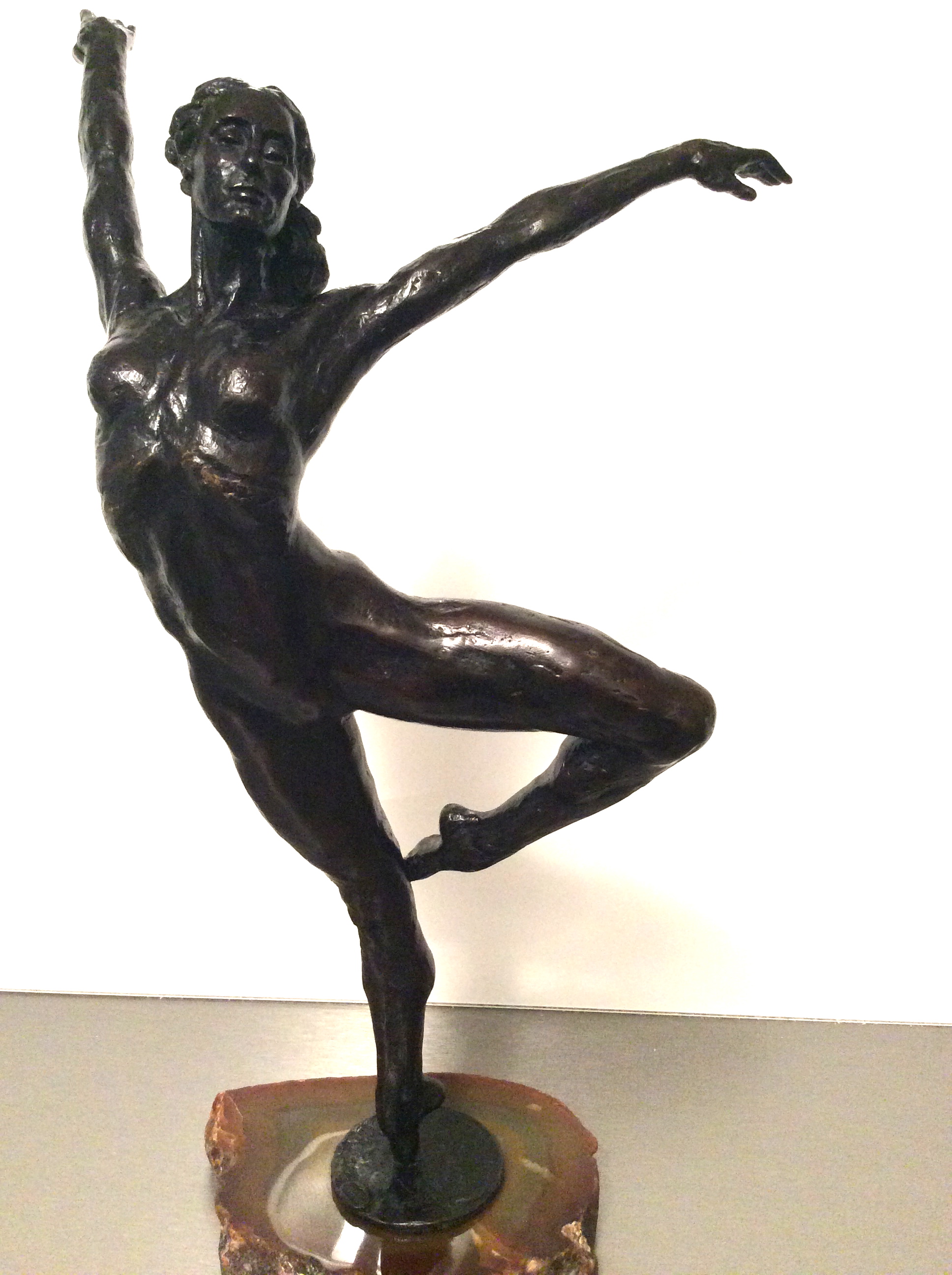 Sculpture en bronze à patine brune sur un socle en pierre dure (agate) représentant une danseuse en mouvement titrée sur la base Mademoiselle Vlassi (pour Christiane Vlassi)