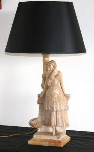 Sculpture en albâtre formant lampe, représentant une jeune femme nattée, se reposant sur une fontaine. Signée à l’arrière de LASCAUD.