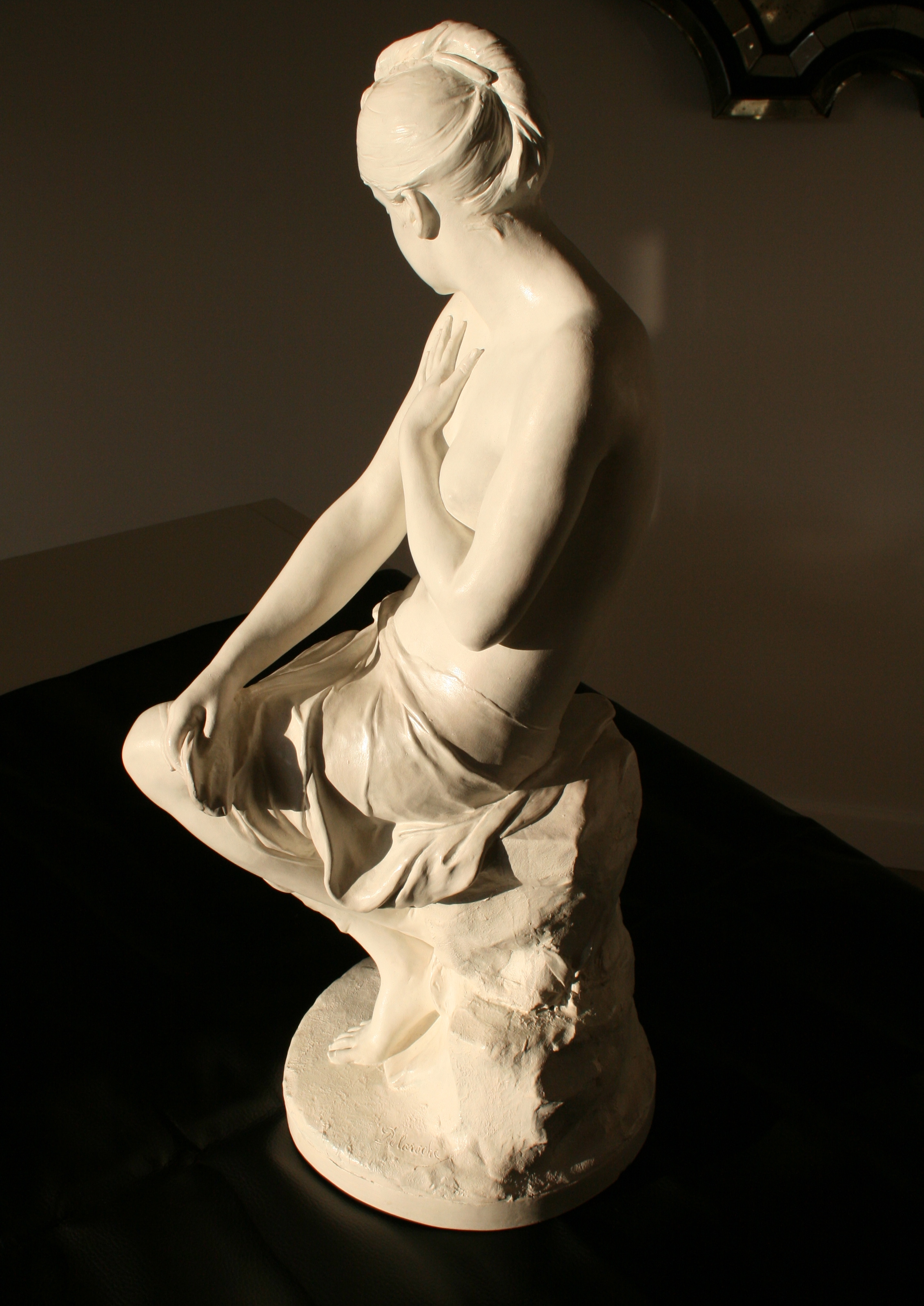 Terracotta sculpture proof in a white patina, imitating marble, from the original marble of the famous artist Paul Hippolyte Delaroche, depicting a young naked woman coming out of the bath, sitting on a rock.