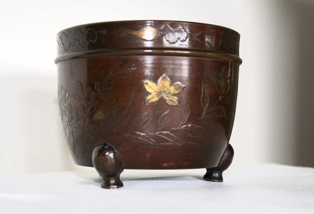 Paire de petits cache-pots à bonsaï en bronze à patine brune ciselé d’un décor floral, reposant sur trois petits pieds patins.