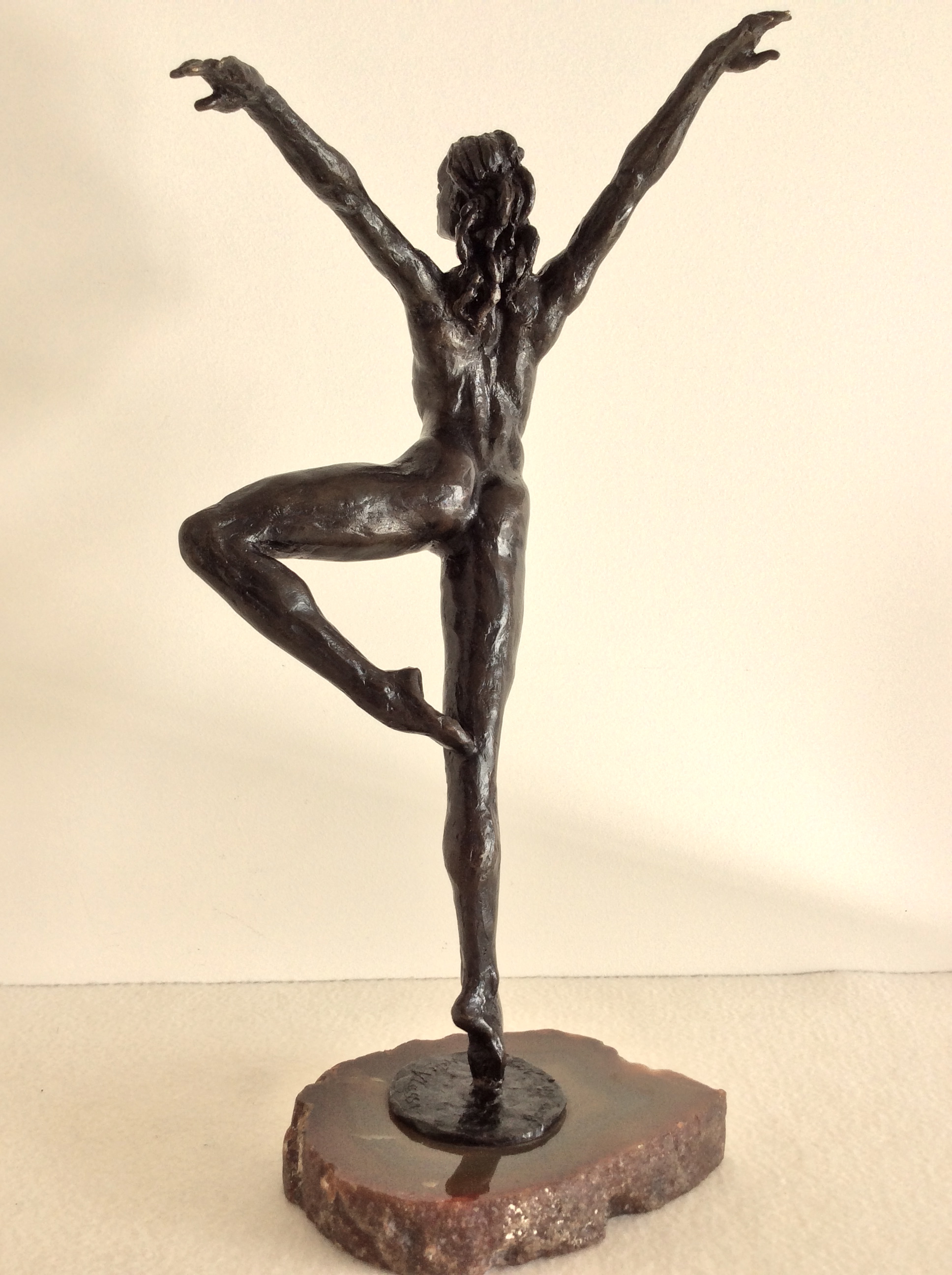 Sculpture en bronze à patine brune sur un socle en pierre dure (agate) représentant une danseuse en mouvement titrée sur la base Mademoiselle Vlassi (pour Christiane Vlassi)