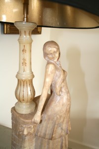 Sculpture en albâtre formant lampe, représentant une jeune femme nattée, se reposant sur une fontaine. Signée à l’arrière de LASCAUD.