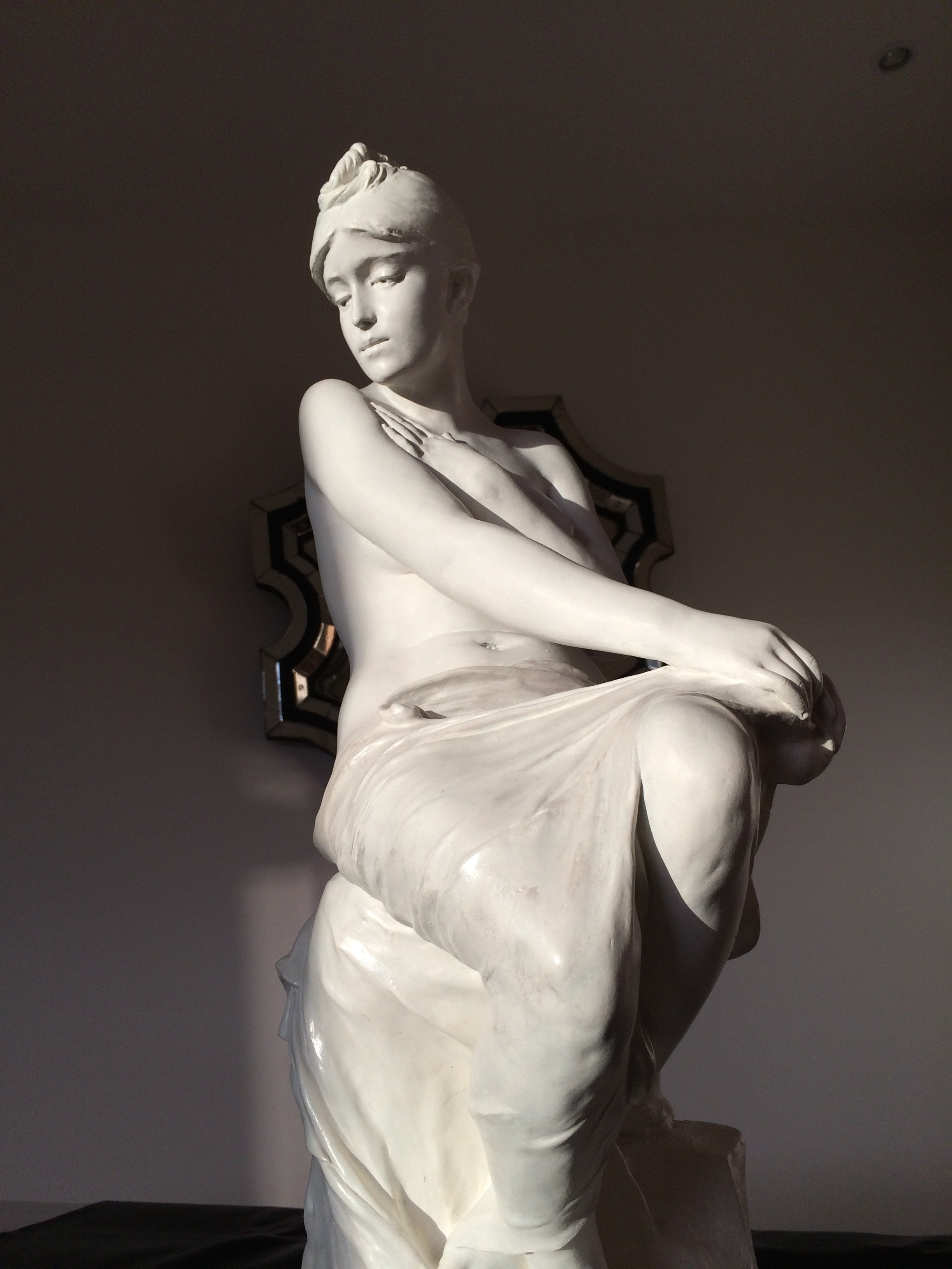 Terracotta sculpture proof in a white patina, imitating marble, from the original marble of the famous artist Paul Hippolyte Delaroche, depicting a young naked woman coming out of the bath, sitting on a rock.