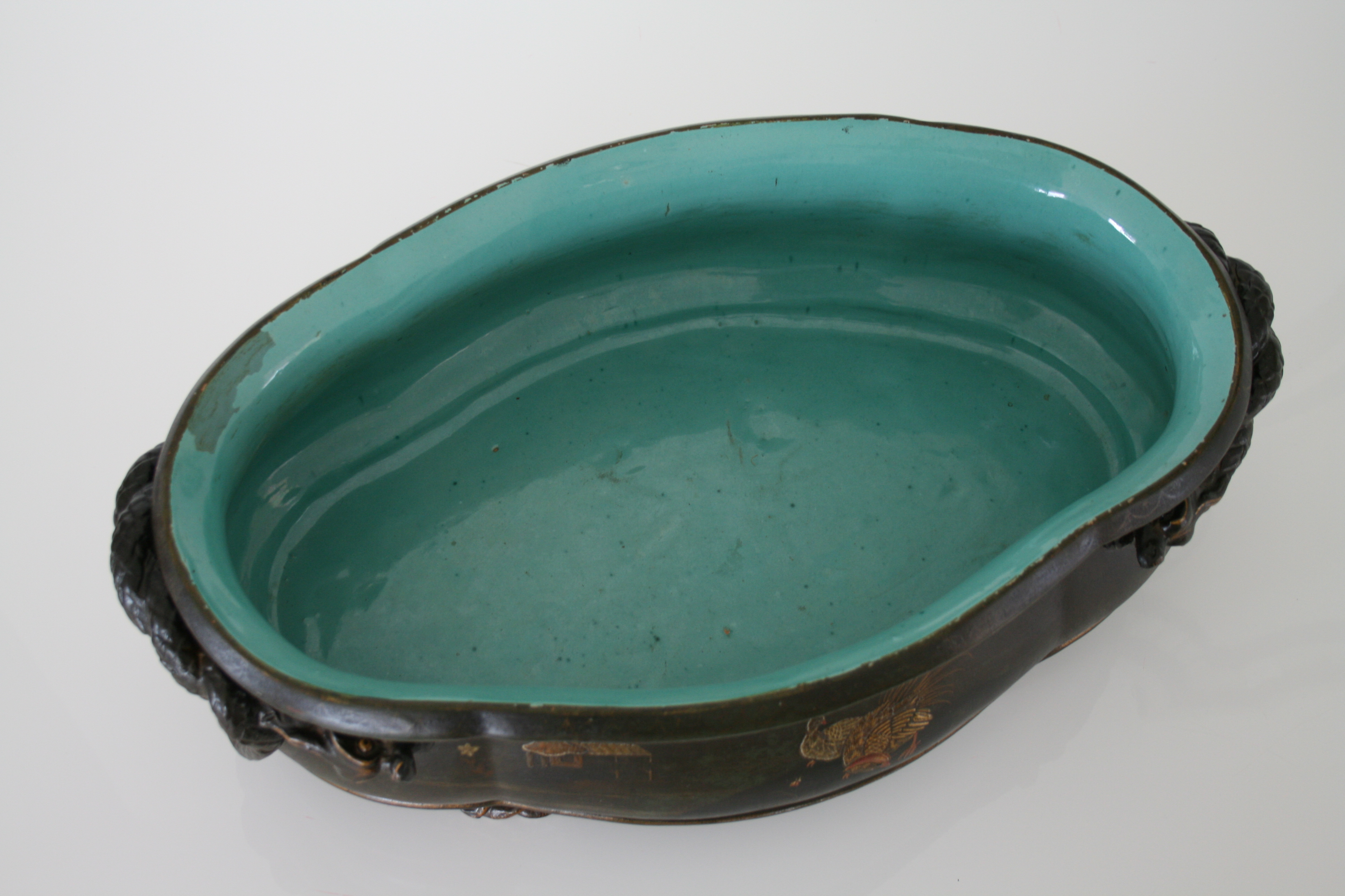 Jardinière de milieu en céramique laquée de couleur brun/bronze à décors japonisant, reposant sur 4 pieds patins.