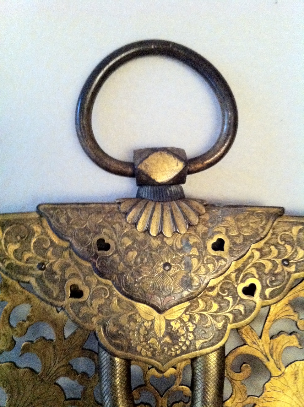 KEMAN, panneau d’ornement en alliage de cuivre doré finement cisélé, à décors de fleurs de Lotus et cordelette nouée en son centre. Décor identique sur les deux faces.