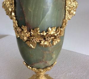Pair of Louis XVI Style casseroles In Onyx Jasper and finely chiseled and gilded bronze mounts decorated with vine branches