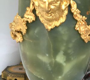 Pair of Louis XVI Style casseroles In Onyx Jasper and finely chiseled and gilded bronze mounts decorated with vine branches