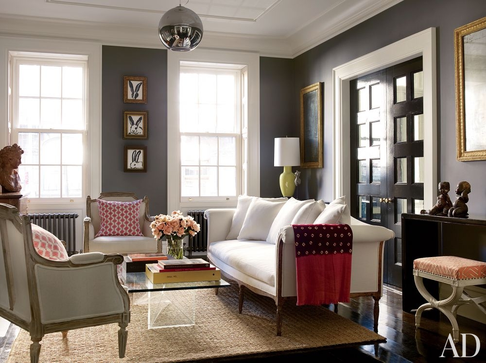A trio of paintings by Hunt Slonem and pillows of a graphic John Robshaw linen accent Brooke Shields’s Manhattan living room; the settee is George III, the curule-form stool is covered in a David Hicks fabric from Lee Jofa, and the jute rug is by Pottery Barn.