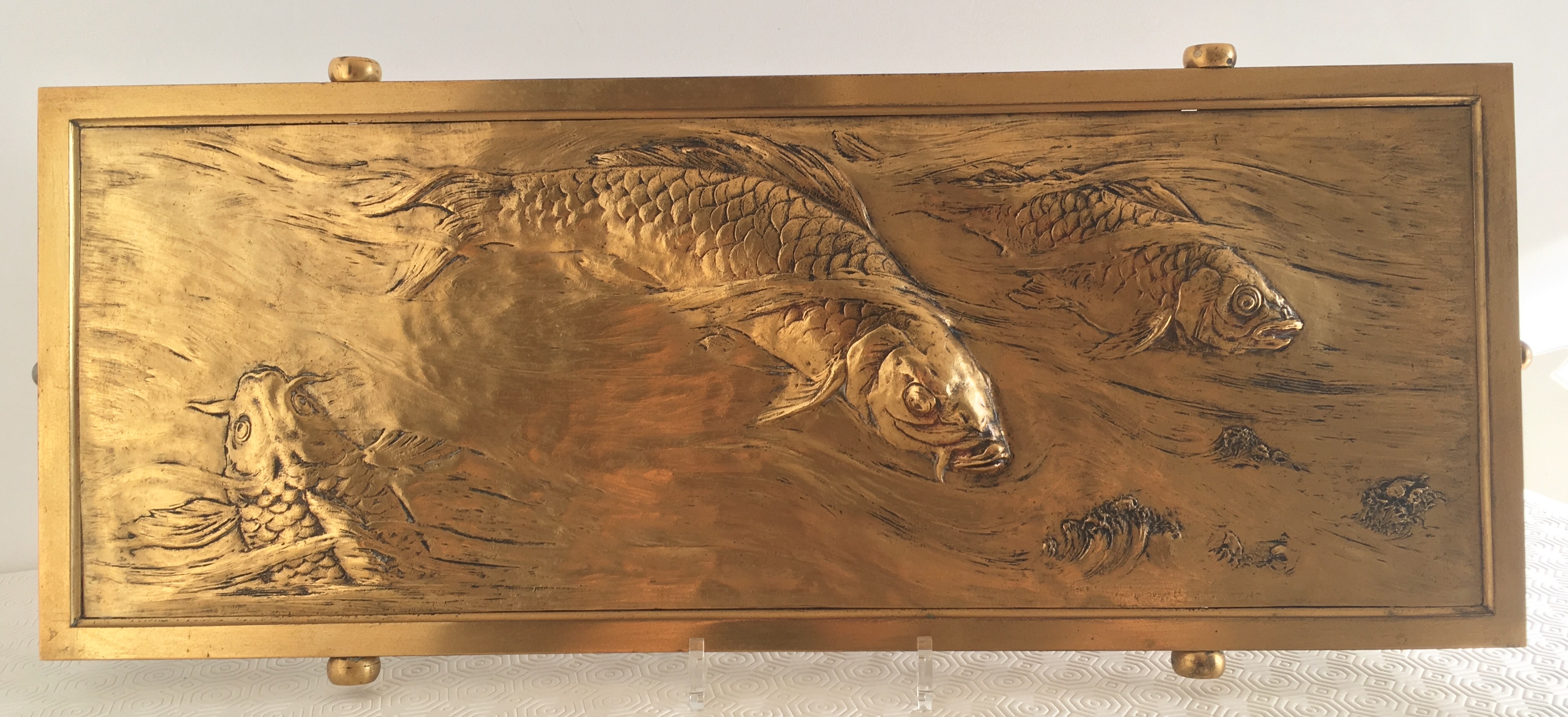 Plaque décorative en cuivre doré, à décors japonisant de carpes koï-