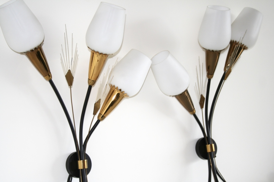 Pair of three branches wall light, in black lacquered metal and polished golden brass.