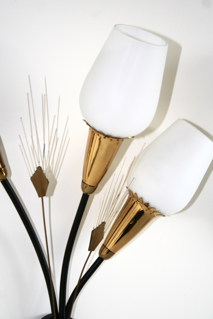 Pair of three branches wall light, in black lacquered metal and polished golden brass.