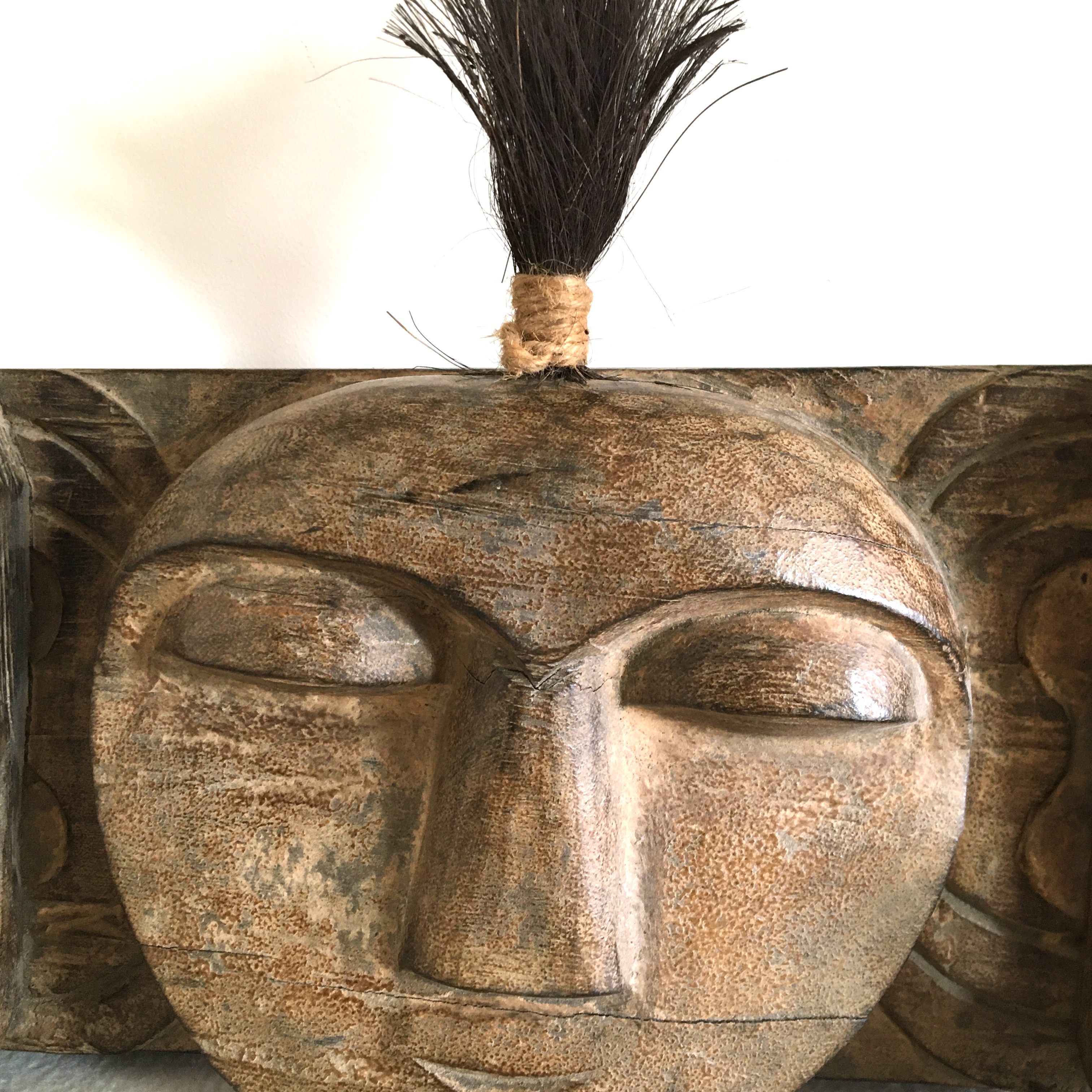 Porte vêtements à 3 patères en bois indigène,À têtes sculptées surmontées d’une hupe en poils animal.