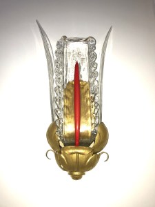 Travail Français des années 1940 – Paire d’appliques en métal feuillagé et doré. Plaques et tiges de verre modelées à chaud, avec application centrale en verre rouge pailleté d’or.