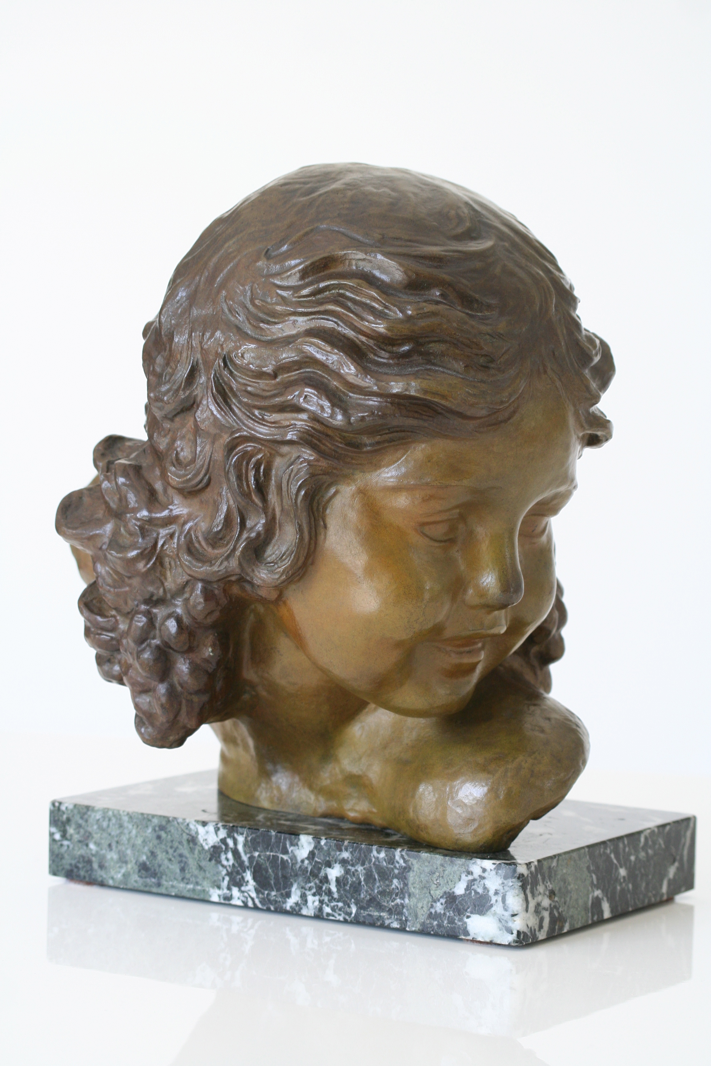 Sculpture en bronze à patine brun vert, sur un socle en marbre vert de mer, représentant un jeune enfant, garçon ou fille, signée de l’artiste Alexandre KELETY (1918-1940)