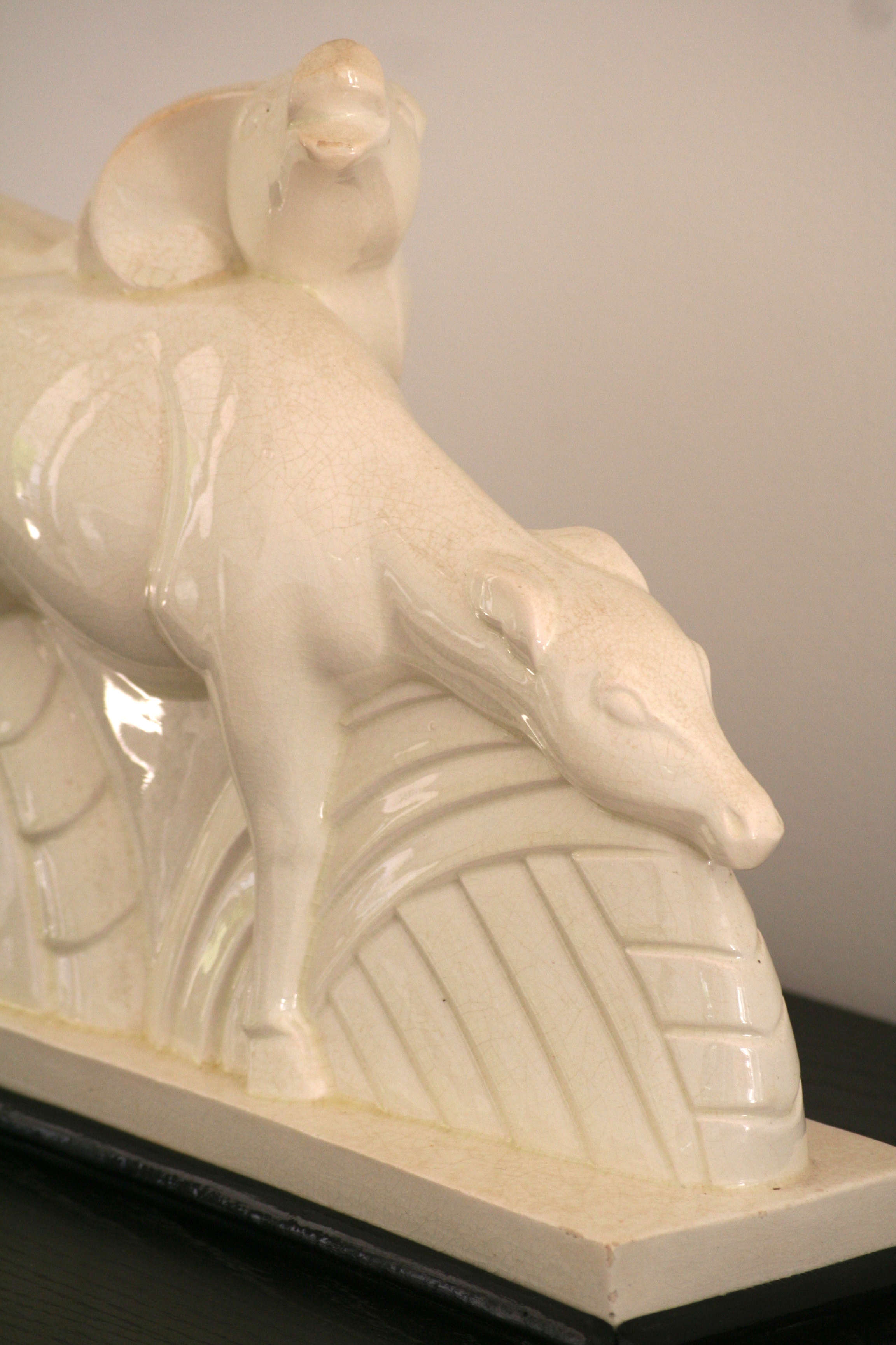Couple d’antilopes dans un décor simulant la savane, en céramique craquelée de Saint Clément, émail de couleur blanc ivoire craquelé, sur un petit socle en bois noirci.