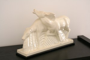 Couple d’antilopes dans un décor simulant la savane, en céramique craquelée de Saint Clément, émail de couleur blanc ivoire craquelé, sur un petit socle en bois noirci.