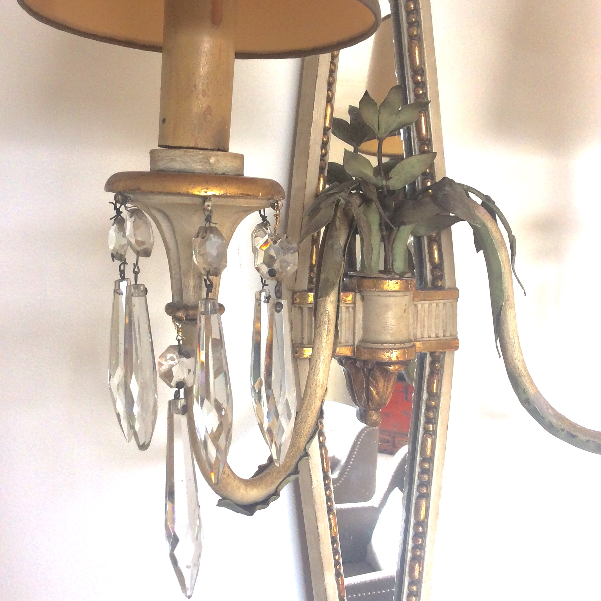 La platine en forme de losange en bois laqué ivoire et doré à fond de miroir, supportant en son centre un bouquet de feuillage en métal laqué, d’où partent 2 branches, se terminant par des bobèches et cristaux.