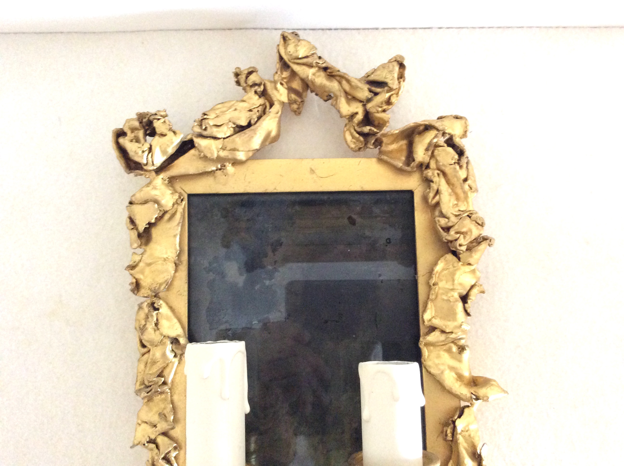 Original pair of sconces with 2 arms, in gilt brass in imitation of crumpled paper, surrounding a rectangular frame with glass bottom, with oxidized patina. Decorator Creation from the 70s.
