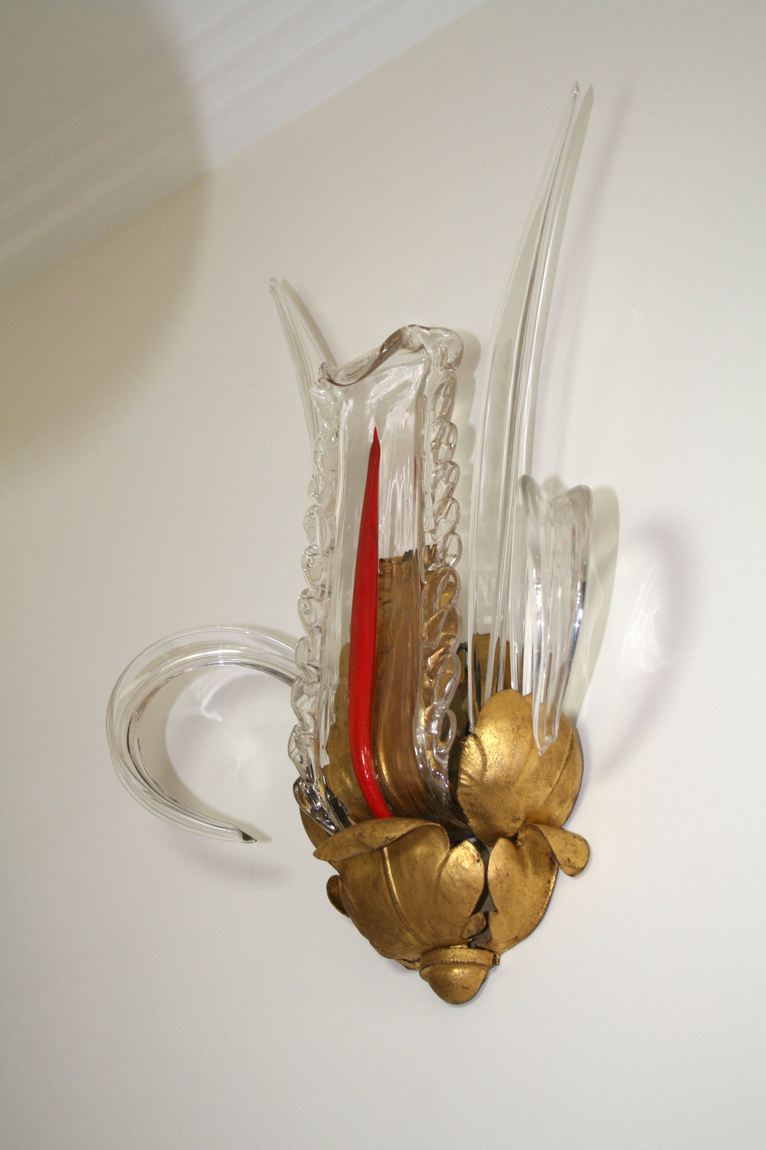 Pair of metal wall sconces gilded in the shape of foliages. Stalks are glass modelled under heat, as well as the central plate which contains in its center an application of red glass spangled of gold.