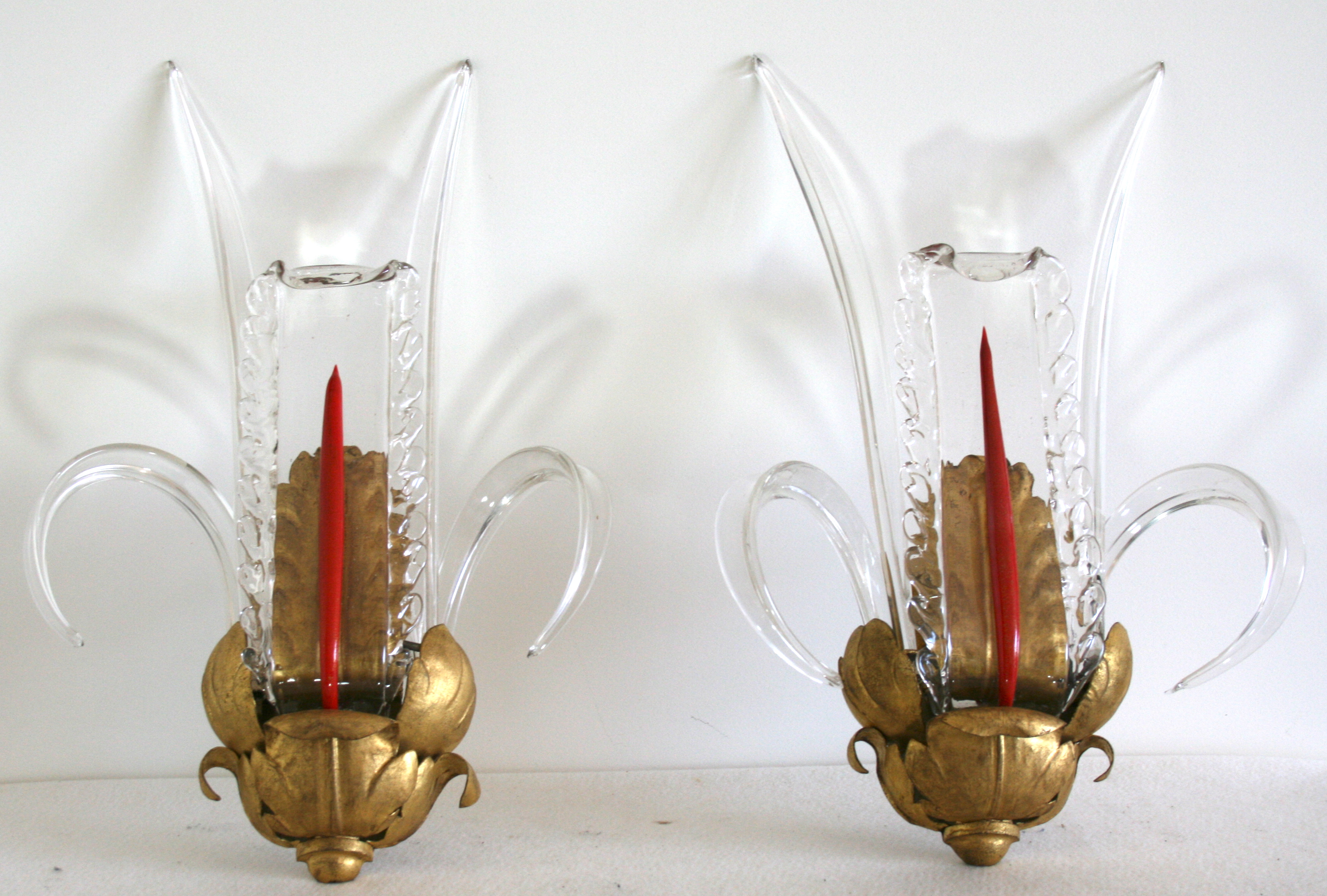 Pair of metal wall sconces gilded in the shape of foliages. Stalks are glass modelled under heat, as well as the central plate which contains in its center an application of red glass spangled of gold.