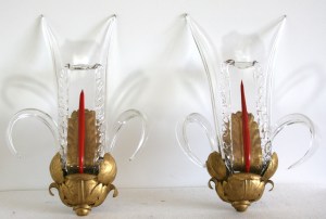 Travail Français des années 1940 – Paire d’appliques en métal feuillagé et doré. Plaques et tiges de verre modelées à chaud, avec application centrale en verre rouge pailleté d’or.