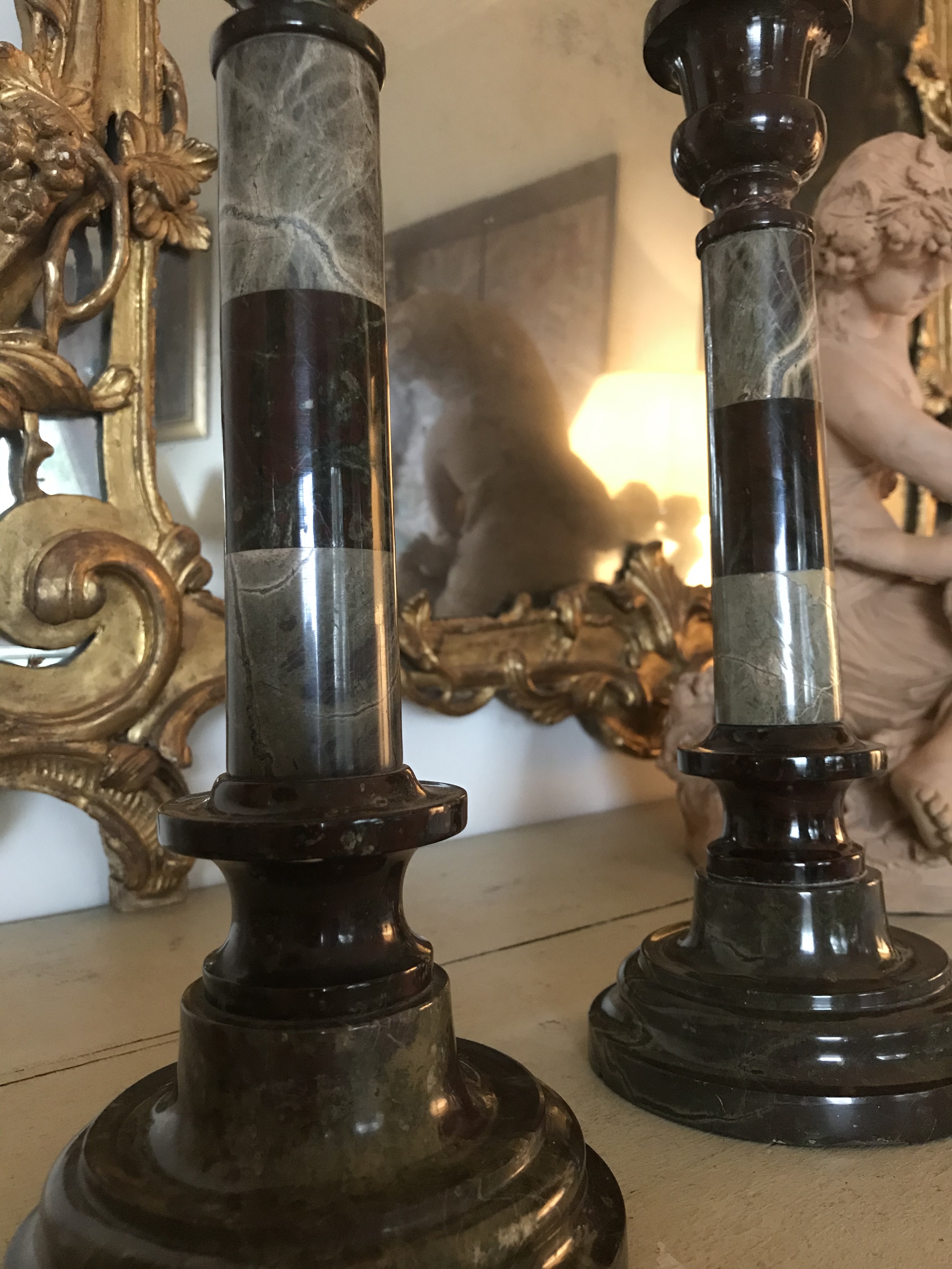 Large pair of bi color marble candlesticks (campan red and sarrancolin)
