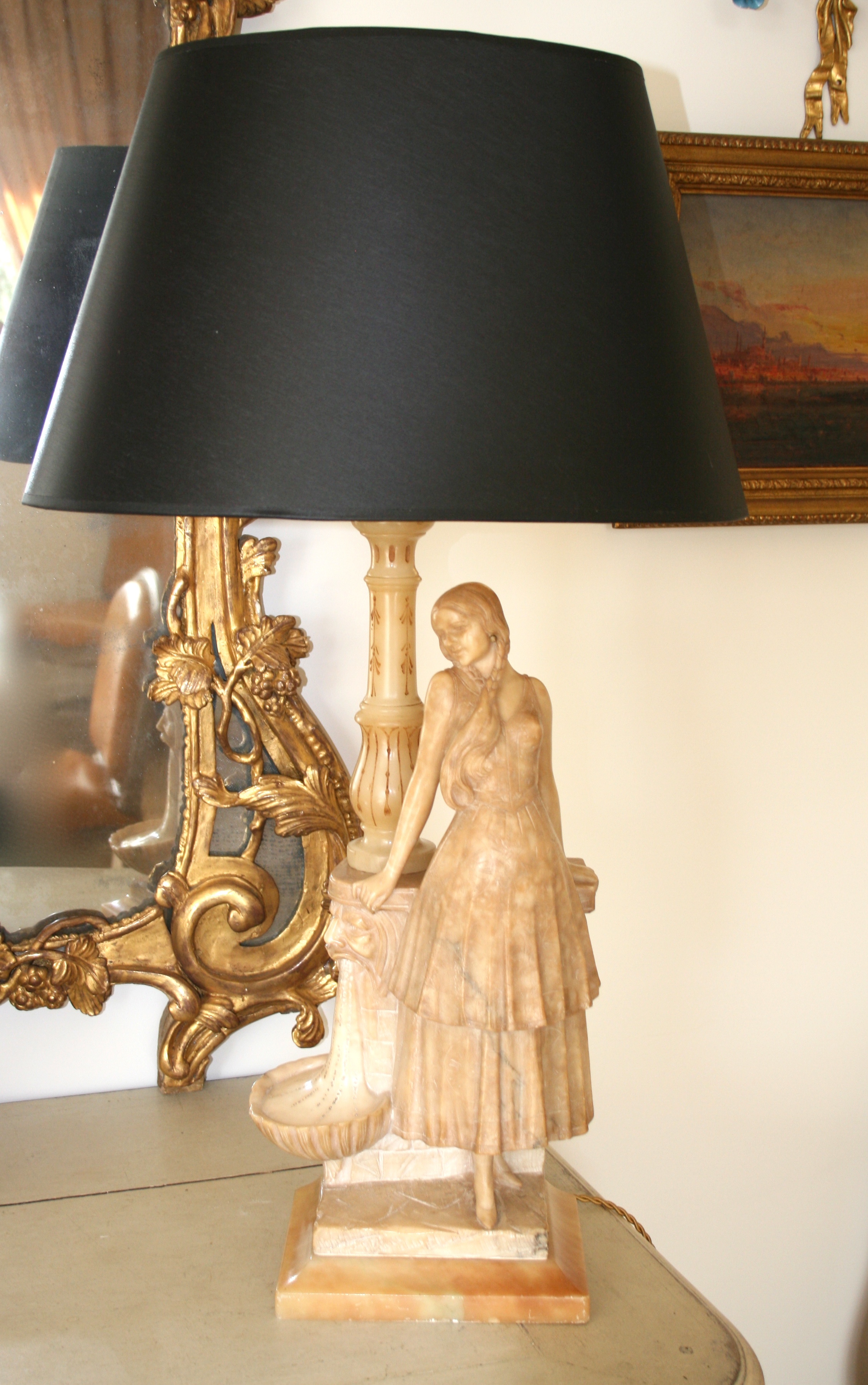 Sculpture en albâtre formant lampe, représentant une jeune femme nattée, se reposant sur une fontaine. Signée à l’arrière de LASCAUD.