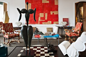 An distorted figure stands tall on a game table in a Barcelona living room which expertly blends contemporary and antique furniture and artwork.